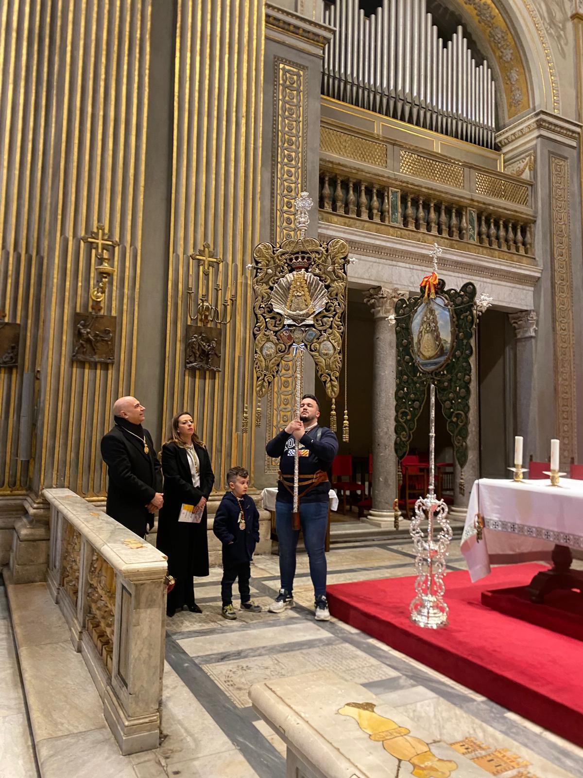 El Simpecado de Emigrantes de Huelva entra en la Basílica de Montserrat de los españoles, para postrarse ante la Virgen del Rocío, encuadrada en el Simpecado de la Hermandad Matriz de Almonte.