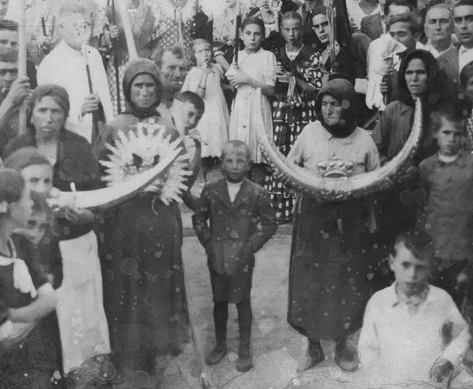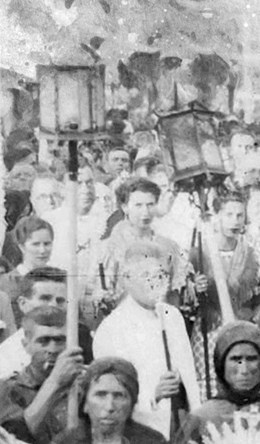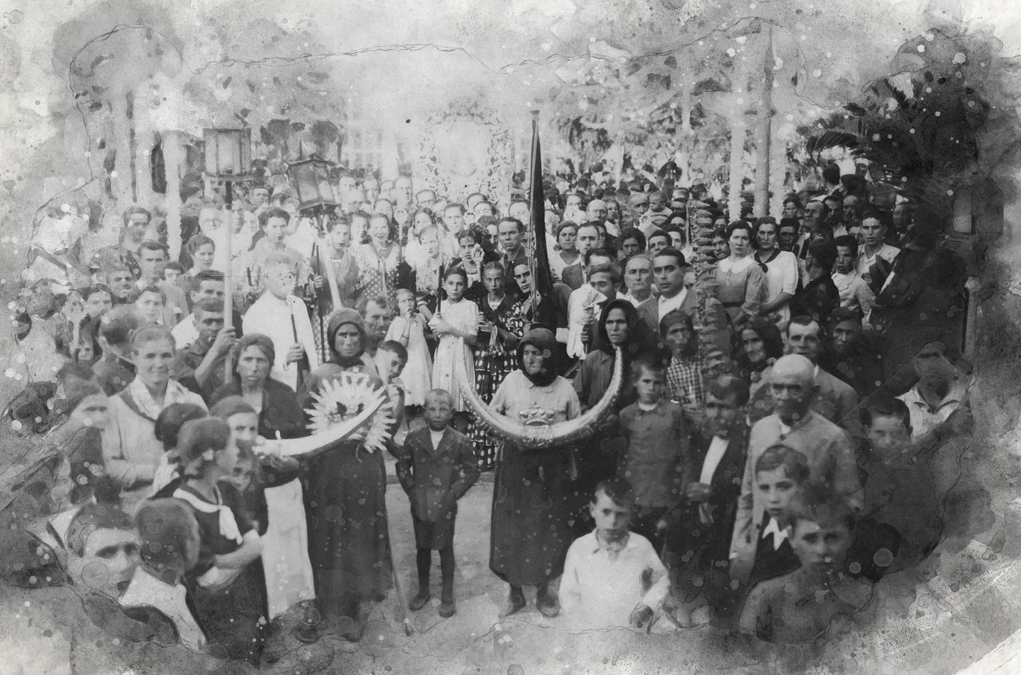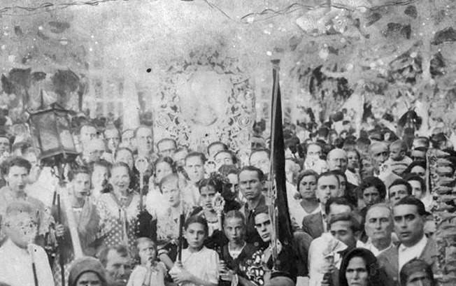 No es difícil adivinar a simple vista sobre el origen de esta fotografía, que evidencia en un primer plano que se trata de una de las Venidas de la Santísima Virgen del Rocío a su pueblo de Almonte. Portadoras de infinitas promesas aparecen inmortalizadas las mujeres almonteñas que ostentan en sus manos varios enseres de plata de su Excelsa Patrona, tras recorrer un largo camino, tradición esta que se origina precisamente en este Traslado, el de 1939, con motivo de la finalización de la Guerra Civil española.