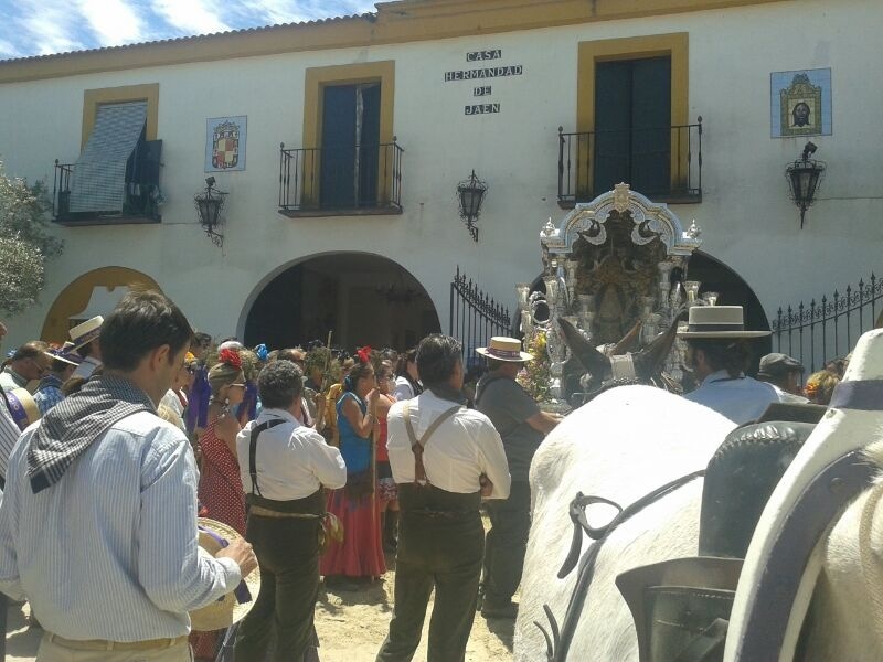 La Hermandad de Jaén, llego ayer a la Aldea del Rocío. La hora de entrada al Puente del Ajoli fue sobre las 13:00 horas y a su casa hermandad en la Avd. de los Ánsares a la 14:00 horas. Gracias a Dios y la Virgen del Rocío, Jaén ha realizado en camino sin mayores problemas, a excepción de un hermano que se cayó de la carreta del Simpecado y nuestro mulero tubo un pequeño transpie a la salida del Quema, ambos sin mayor relevancia. Por todo lo demás muy bien, promesas cumplidas y otro año más.