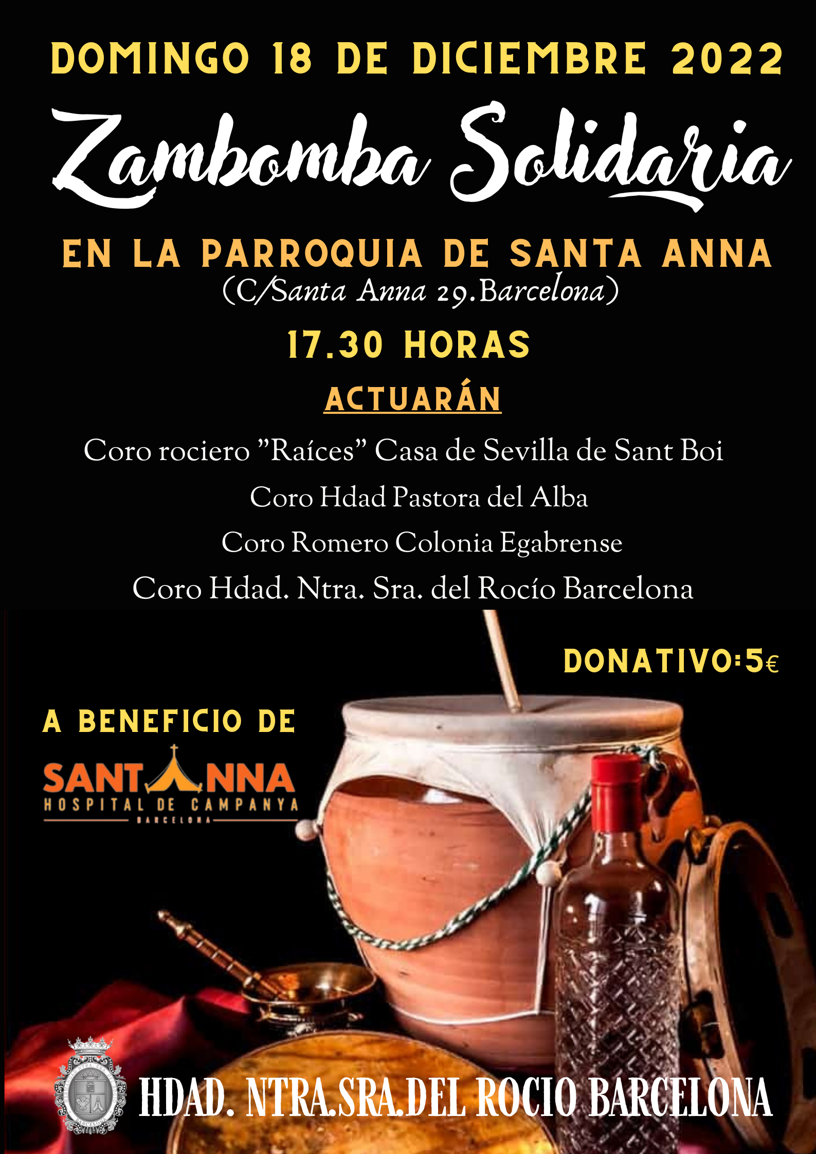 El domingo 18 de diciembre la Hermandad de Nuestra Señora del Rocío de Barcelona celebrará, en la entrada de la parroquia de Santa Anna, su tradicional Zambomba de Navidad.