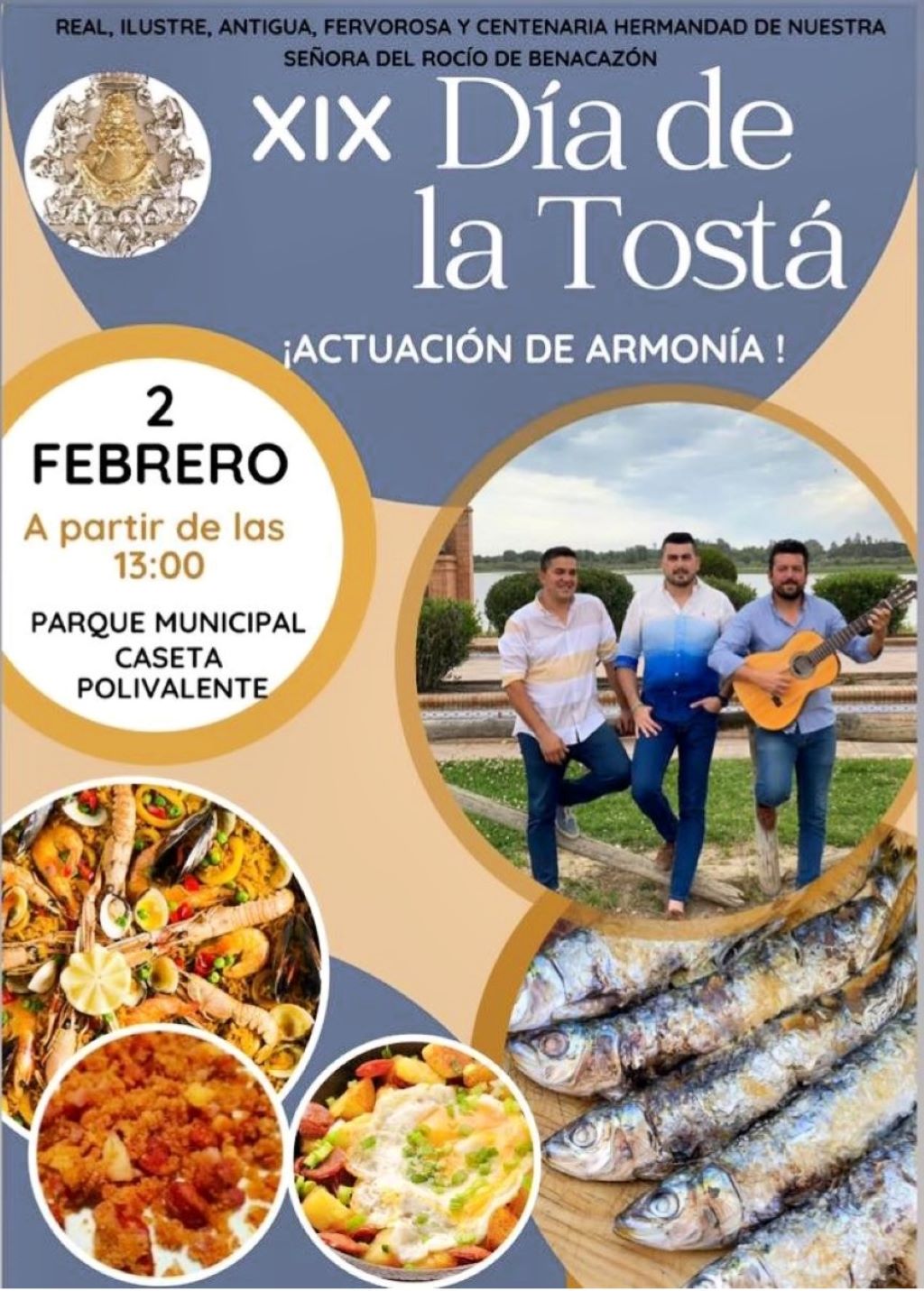 La Hermandad del Rocío de Benacazón celebrará el próximo domingo 2 de febrero una nueva edición del tradicional Día de la Tostá, una cita gastronómica y festiva que reunirá a vecinos y visitantes a partir de las 13:00 horas en la Caseta Polivalente del Parque Municipal.