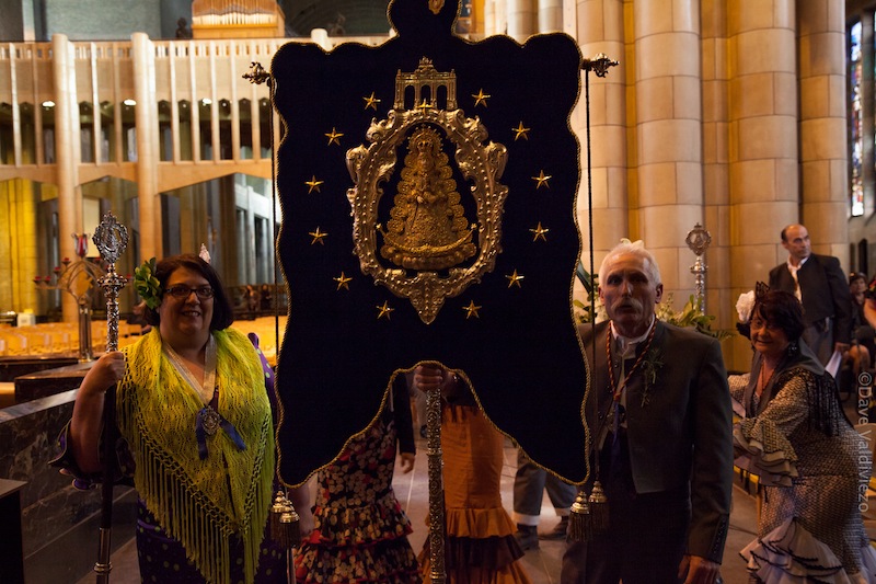 Antes de dar comienzo a la celebración, los peregrinos allí presentes marchamos en procesión por la Basílica al son de pitos y tamboriles, siempre al lado del Simpecado y Banderín de la Hermandad. Momento muy emocionante que nos trasladó a la Aldea.