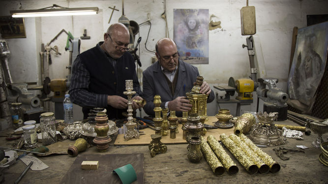 Los hermanos José y Ángel Delgado en su taller de la calle Goles