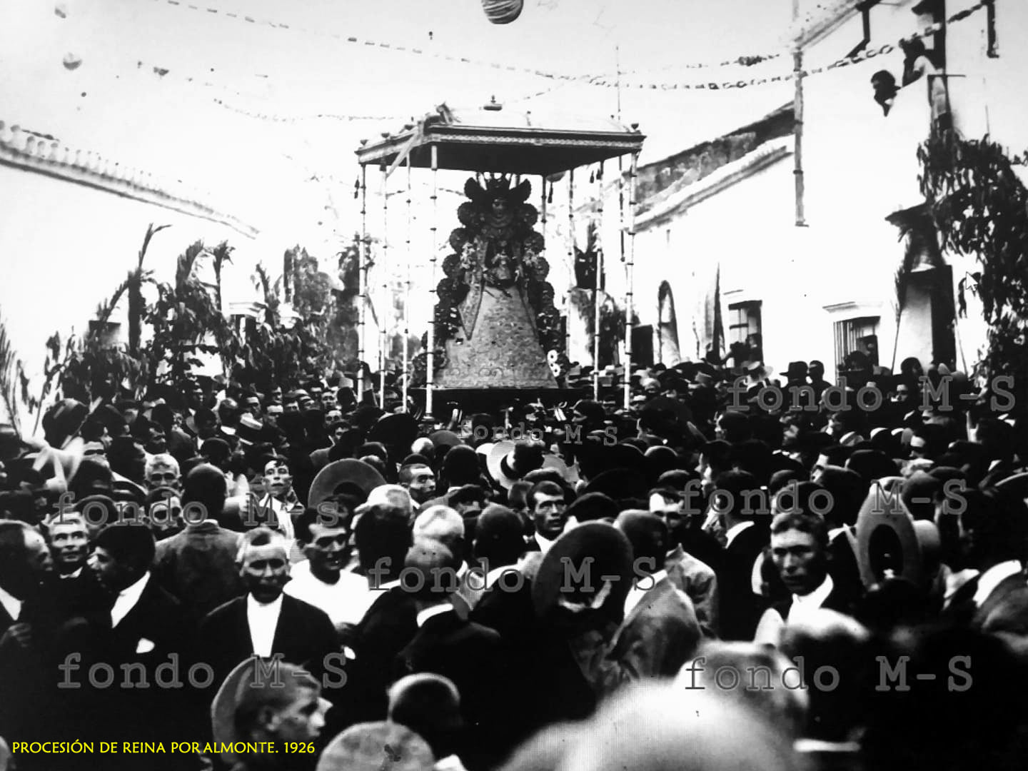 La fotografía que ilustra el artículo está realizada el 8 de agosto de 1926, ya que el traslado se produjo el 6 de junio por la finalización de la guerra de Marruecos. La Virgen que luce sus galas de Reina con las ráfagas de plato del revés, procesiona sobre las antiguas andas de Juan de Astorga, de la que pende en el palio los borlones de las bambalinas de 1908. Obsérvese con atención el exorno de la calle. Aun en 1926 no se estilaba las guirnaldas de flores de papel que comenzaron a utilizarse en la década de 1930. Hasta entonces, se pendían desde fachadas a fachadas cadenetas y farolillos de papel. Sobre los ventanales y puertas de las casas, se formaban un arco de triunfo con las hojas de las palmeras (palmarates), e incluso se aprecia ramas de eucaliptos. También era tradición extender el romero en el suelo, costumbre que se mantenía desde el siglo XVIII.