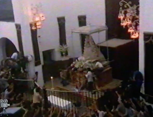 En la jura de Hermanos Mayores, podemos distinguir perfectamente a quien fuera Presidente de la Hermandad Matriz, D. Santiago Padilla Espina, gran impulsor del mundo rociero, así como a la Infanta Esperanza y su marido, D. Pedro.