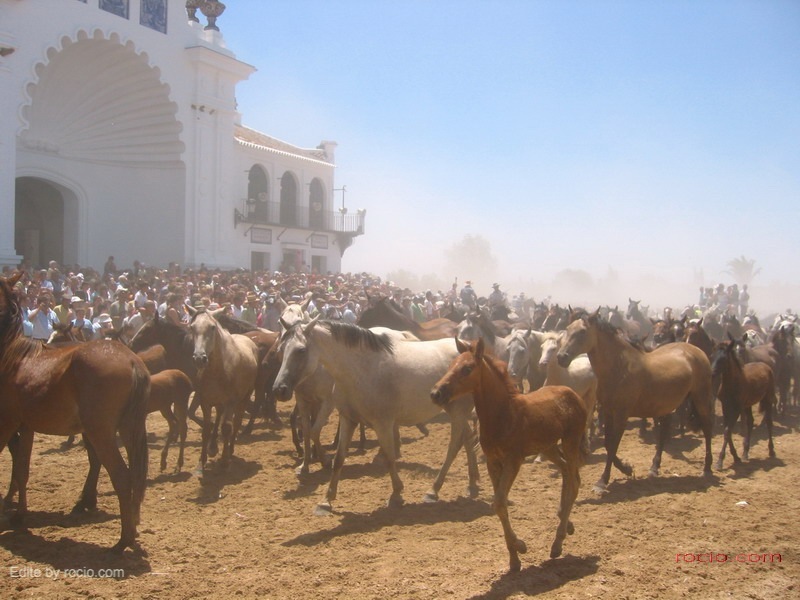 Sobre las 2 de la tarde aparecieron los primeros yeguerizos anunciando la llegada de las diferentes tropas de animales. El momento fue espectacular como podéis ver en las fotos que acompañan este escrito. Las bestias, a las que se les había cerrado el paso a la altura de la Hdad. de Moguer por un lado y a la de Huevar por el otro, deambulaban de aquí para allá en una nube de polvo que envolvía la silueta de la ermita y a los asistentes.