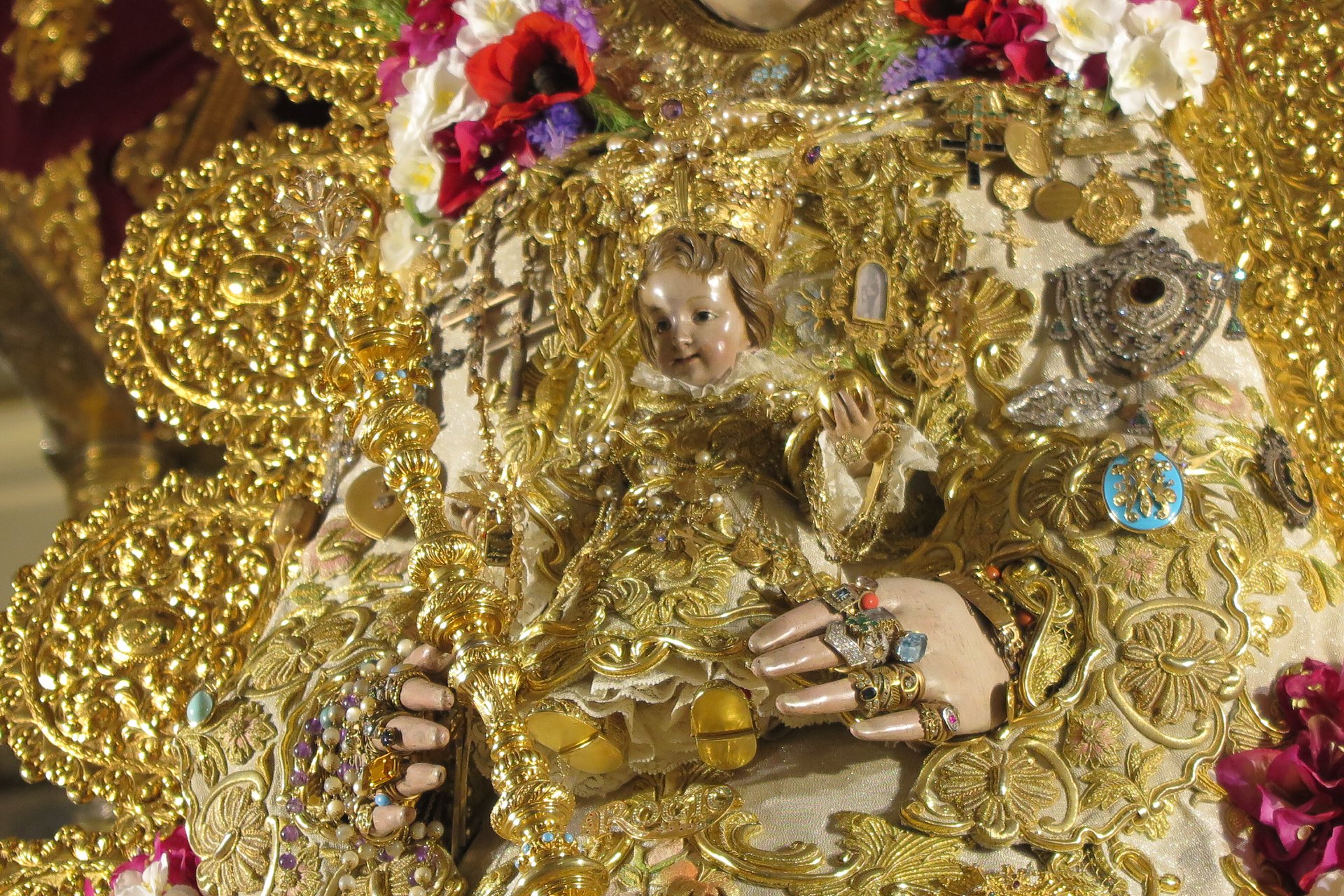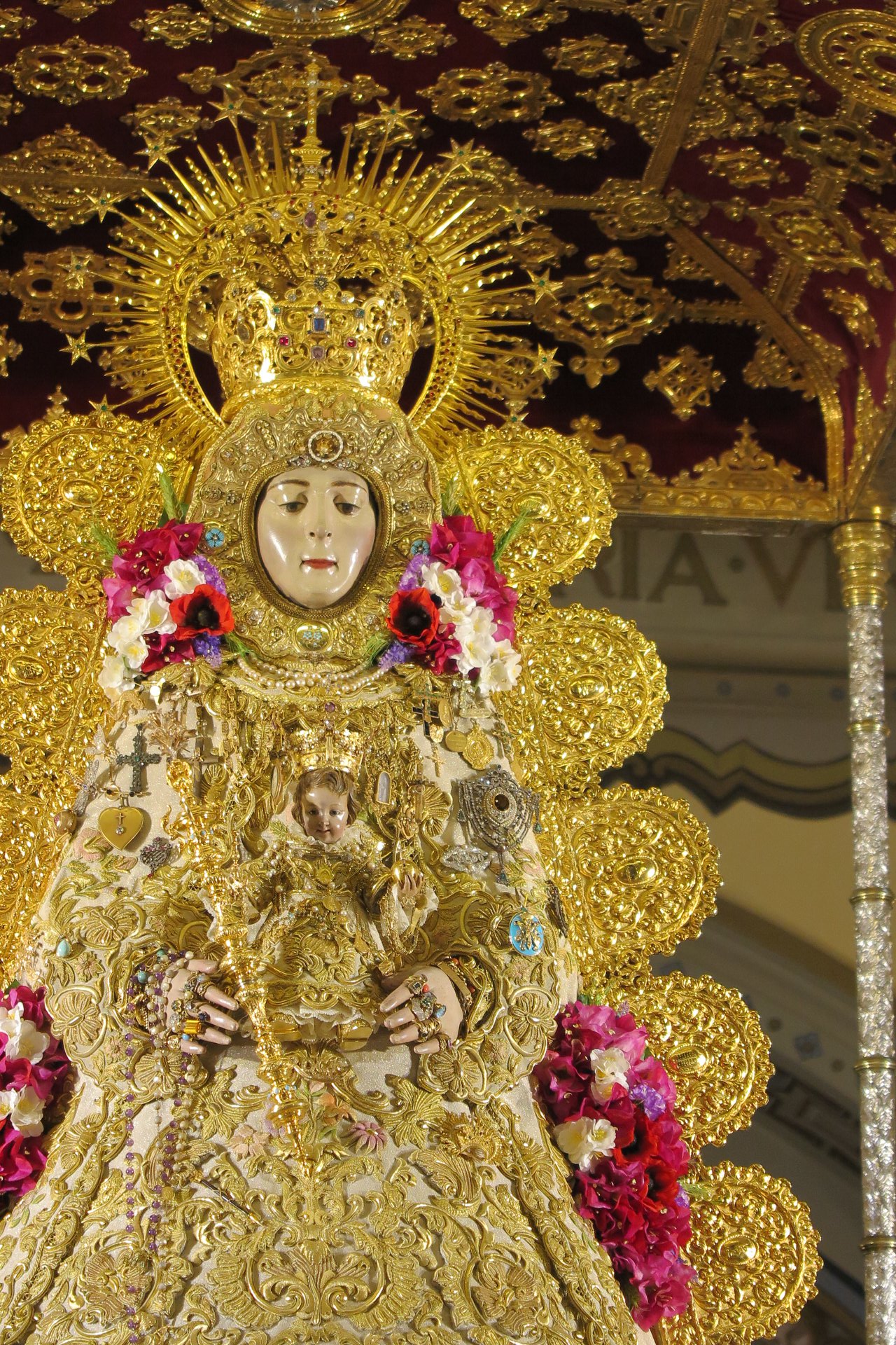 El rostrillo de la Virgen es el regalado por el canónigo Juan Francisco Muñoz y Pabón para el día de su coronación. La Virgen y su Hijo lucen las coronas de esta histórica efeméride, celebrada en 1919. Porta el cetro de las azucenas, confeccionado y donado por Orfebrería Sanlúcar, en 2009.