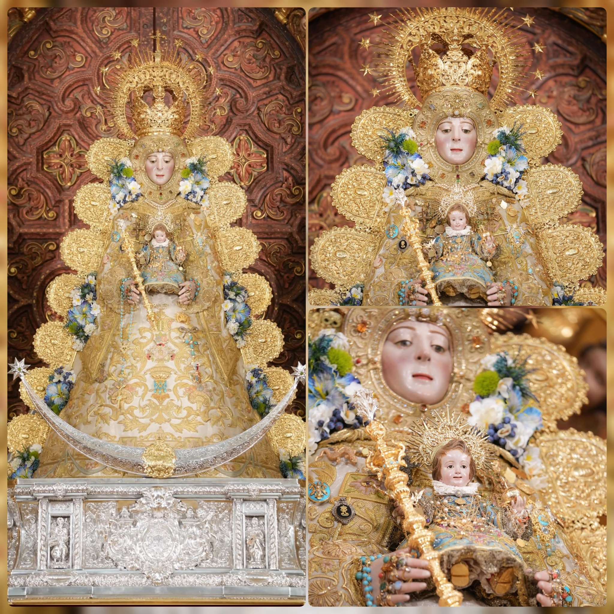 La Virgen del Rocío amanece vestida de Pureza y Gracia en vísperas de la festividad de la Inmaculada Concepción, una celebración mariana de profunda relevancia en la historia del Rocío.