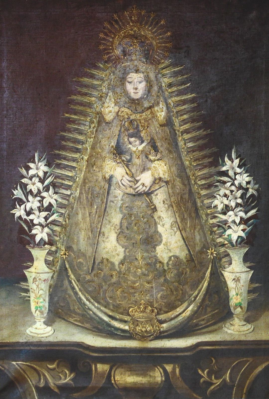 Conservada por la insigne y muy devota familia «Cepeda», se trata de una de las antiguas representaciones más fidedignas que existe sobre la Virgen del Rocío.Fue pintado por el reputado sevillano, Antonio Alonso-Morgado González en 1875. En ella podemos destacar varios detalles como las ráfagas de rayos biselados, donde se aprecian como las cabezas de los querubines que adornan la pieza estaban sobre dorados en contraste de la plata del conjunto. Sobre la cabeza de la Imagen, reposa la llamada corona del sol, una presea posiblemente del siglo XIX, hoy en desuso. Enmarcando su rostro, aparece un rostrillo que fue recuperado en 2021 y que perteneció a la Virgen, de cual no podemos constatar con seguridad por qué se encontraba custodiada por la familia Cepeda. Interesante también es el atuendo dieciochesco que luce la Señora. Se trata del traje regalado a la Virgen en 1753, por el primer centenario como Patrona de Almonte y quien hizo de intermediario para su ejecución, el almonteño José Carlos Tello de Eslava. Al menos en 1900 se seguía utilizando.