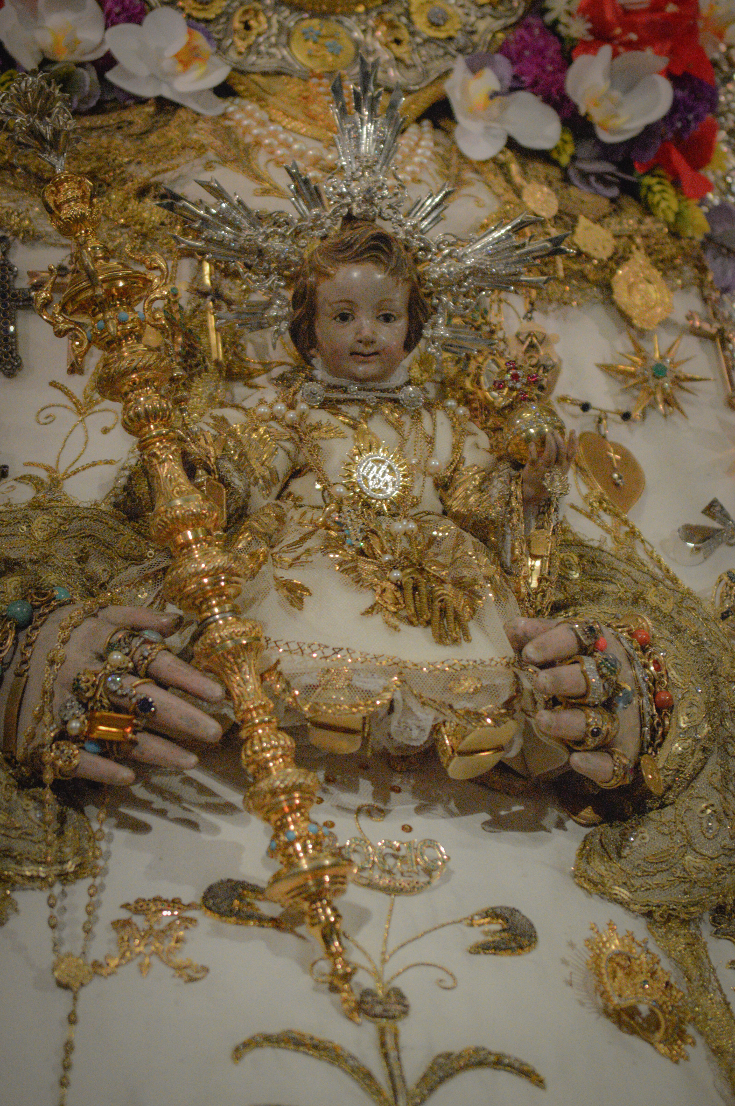 La Virgen continúa con el traje conocido como “de la garrapata”, en alusión al bordado que aparece en la saya. Sin embargo, el Pastorcito luce un nuevo traje, regalo de la Hermandad del Rocío de Villanueva del Ariscal el pasado mes de febrero. Está confeccionado en mikado de seda 100%, con encaje de oro. Su manufactura es de hojilla de oro, del siglo XVIII. Realizado en el taller de Manuel Zerpa, está adornado por un conjunto de borlas, también de la misma época, que conforman el cíngulo.
