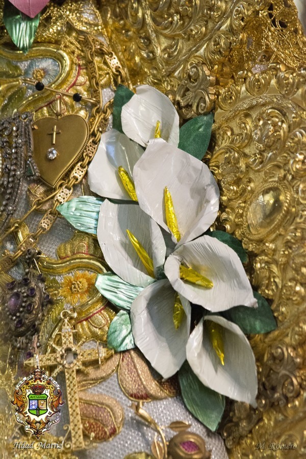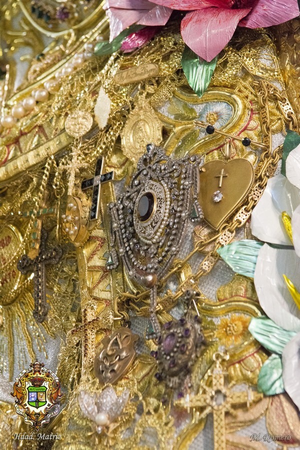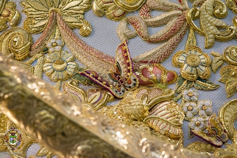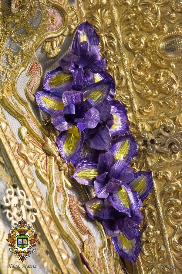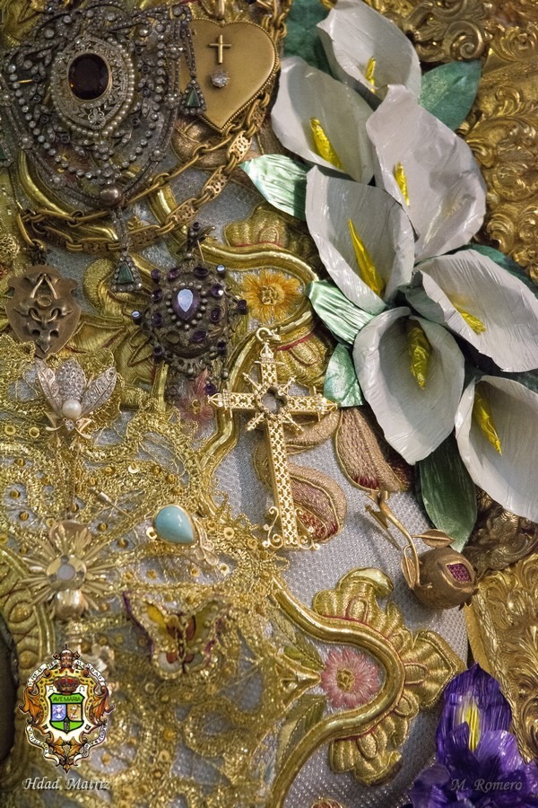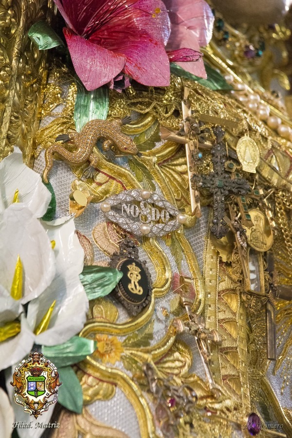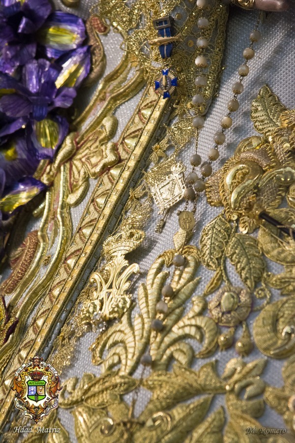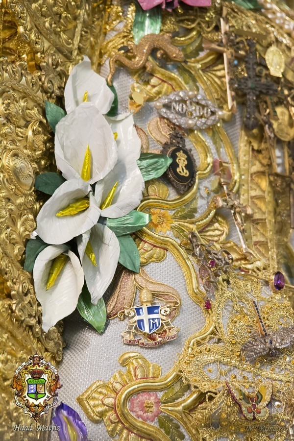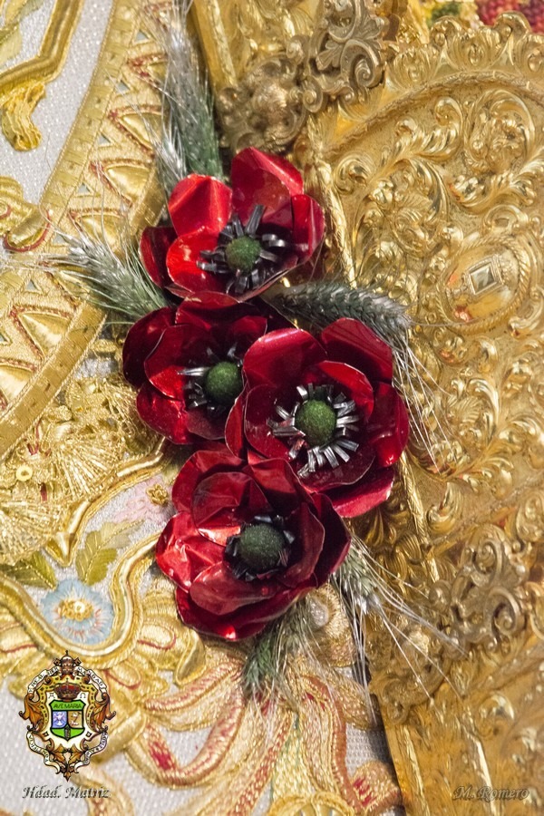 El traje y el manto han sido donados por el propio bordador y la ciudad de Jerez de la Frontera y fueron bendecidos en el Santuario el pasado 4 de mayo. Las flores que acompañan al vestido, realizadas por José Manuel Vega, son amarilis, calas, iris-lirio, amapolas y flor de la jara. Todo en talco esmaltado.