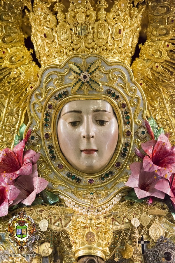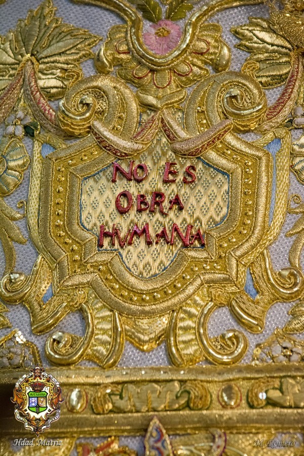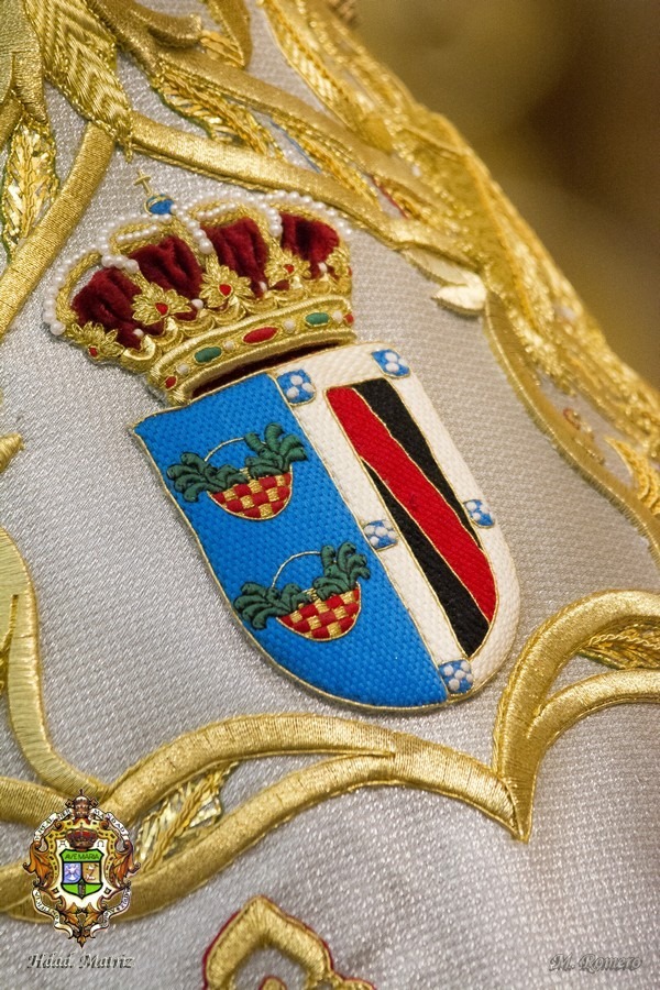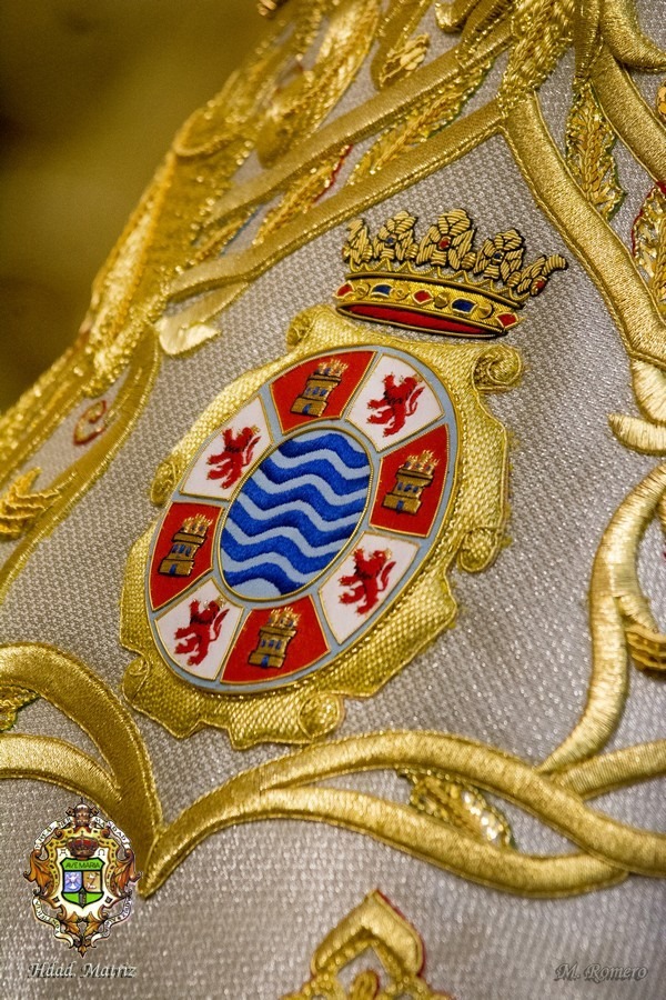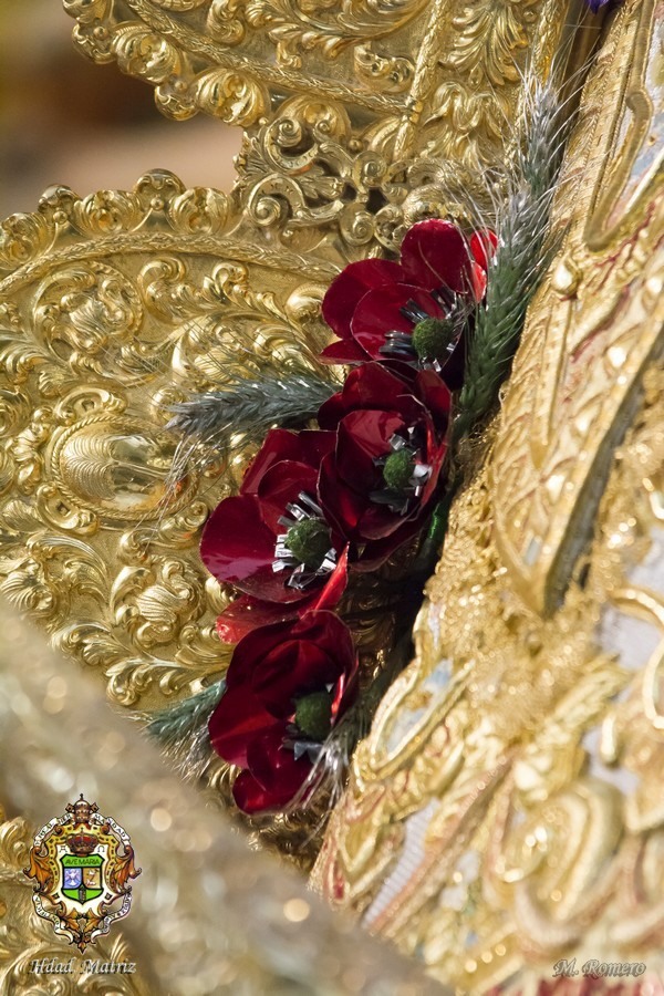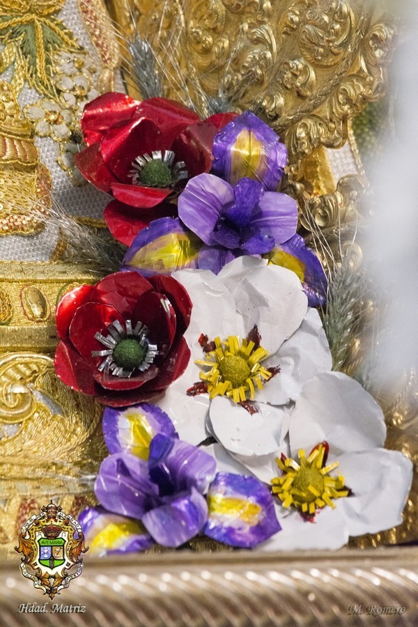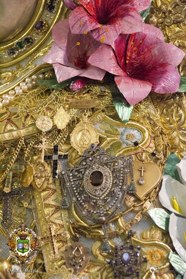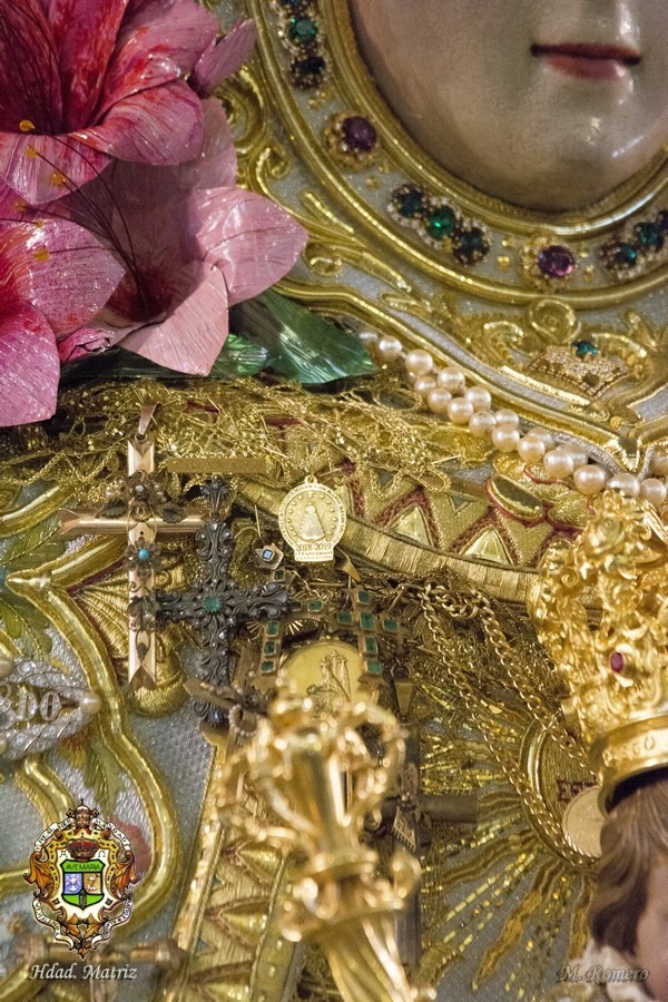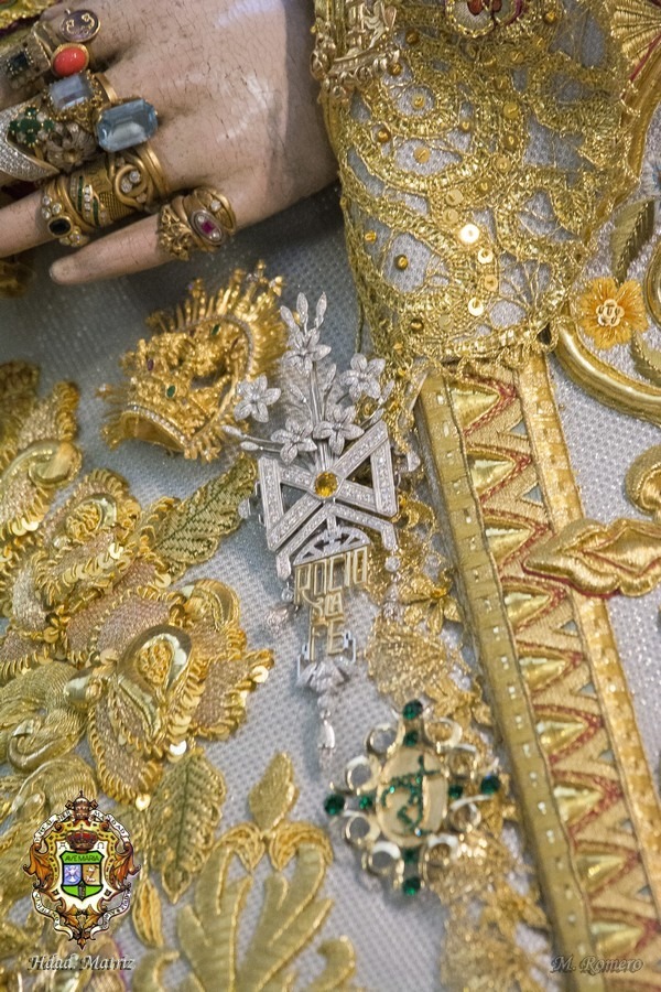 El traje y el manto han sido donados por el propio bordador y la ciudad de Jerez de la Frontera y fueron bendecidos en el Santuario el pasado 4 de mayo. Las flores que acompañan al vestido, realizadas por José Manuel Vega, son amarilis, calas, iris-lirio, amapolas y flor de la jara. Todo en talco esmaltado.