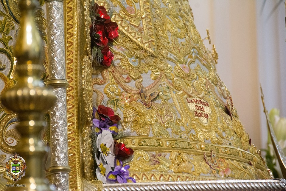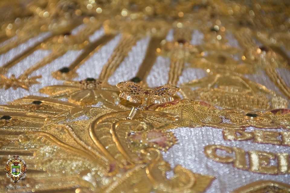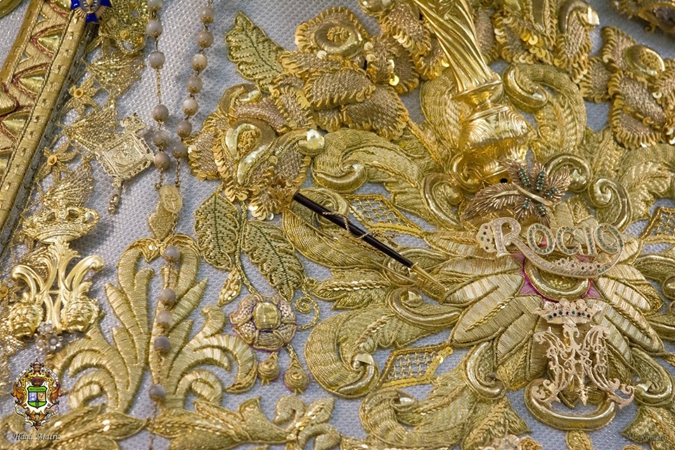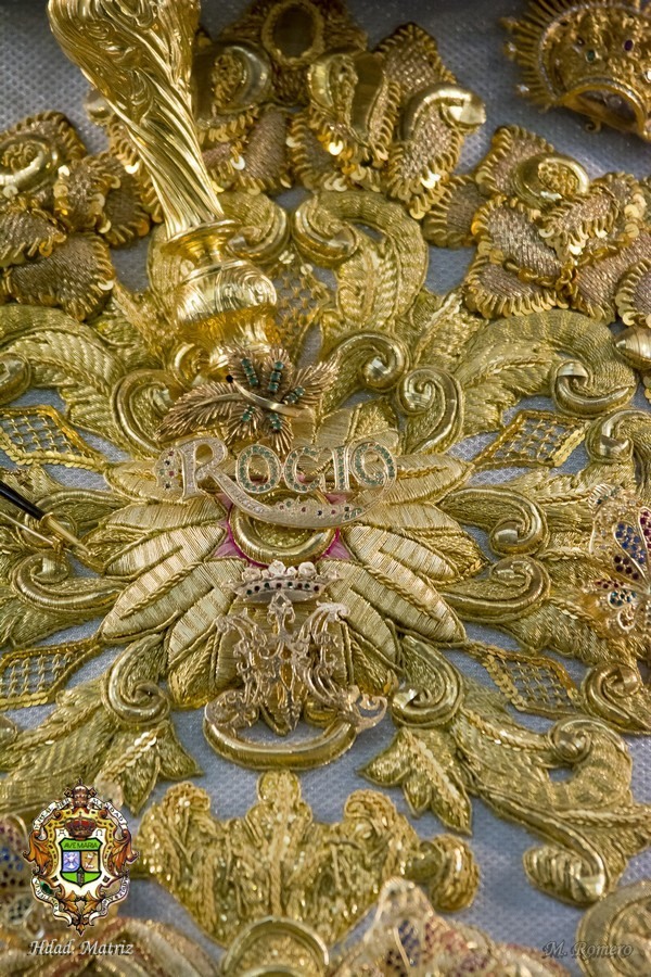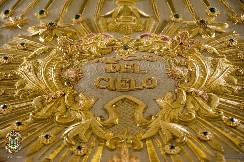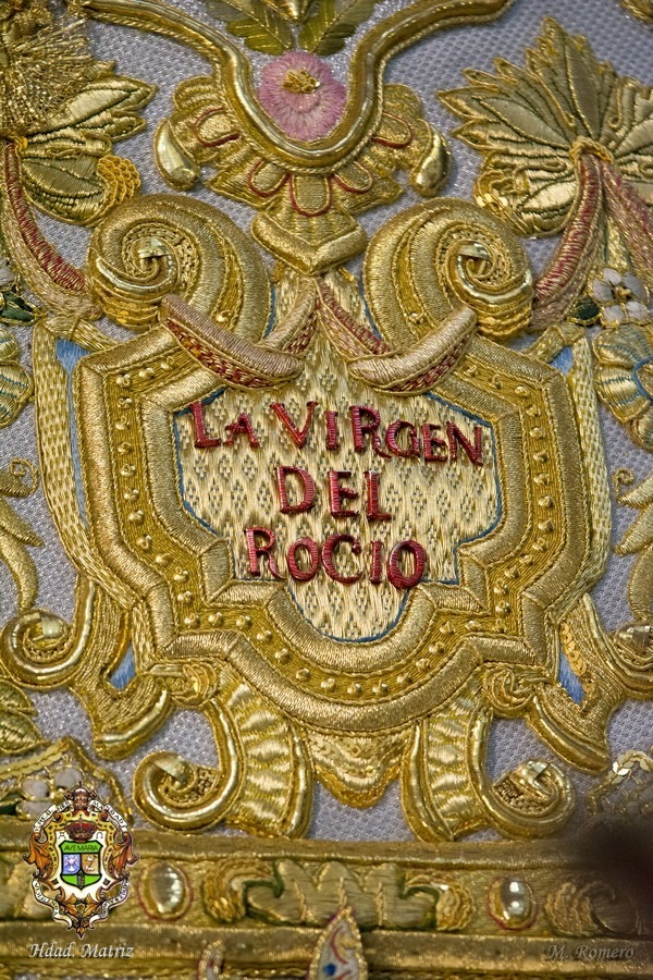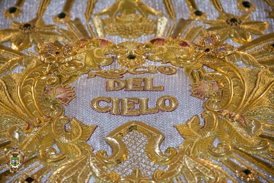 En la pasada noche, las hermanas camaristas, procedieron a entronizar en su paso procesional a la Santísima Virgen del Rocío, que en esta Romería luce un nuevo traje completo, realizado en el taller de bordados del jerezano Fernando Calderón. El Pastorcito viste a juego.