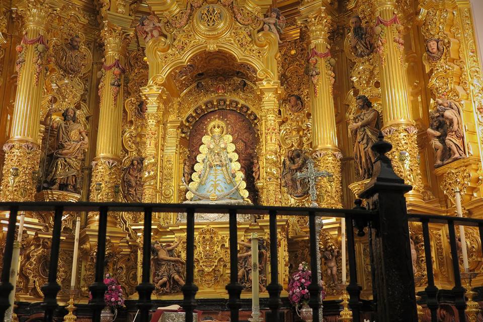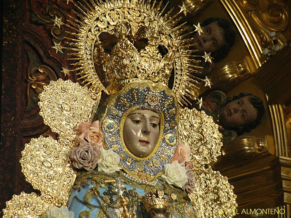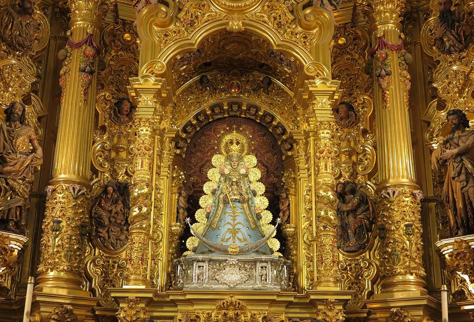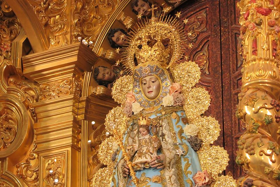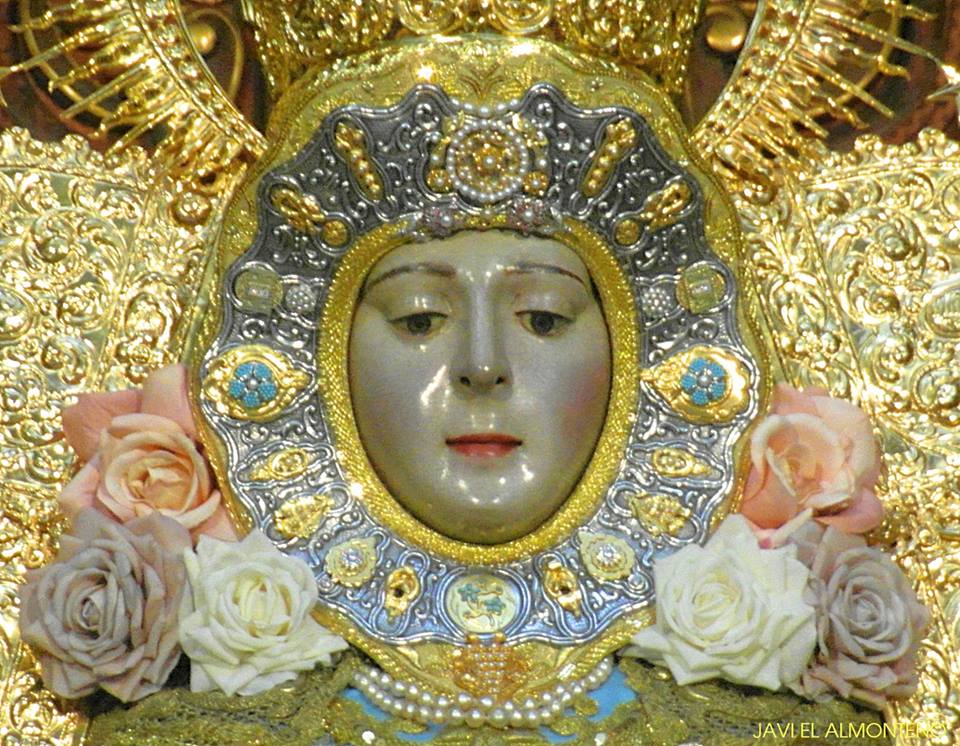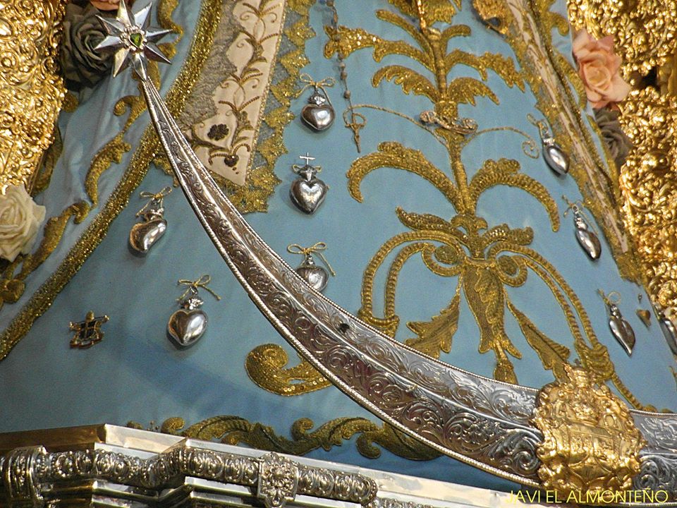 La Virgen del Rocío, luce en su saya -brazo derecho- el Lazo de platino y brillantes que el Foro del Rocío le regaló en el año 2003