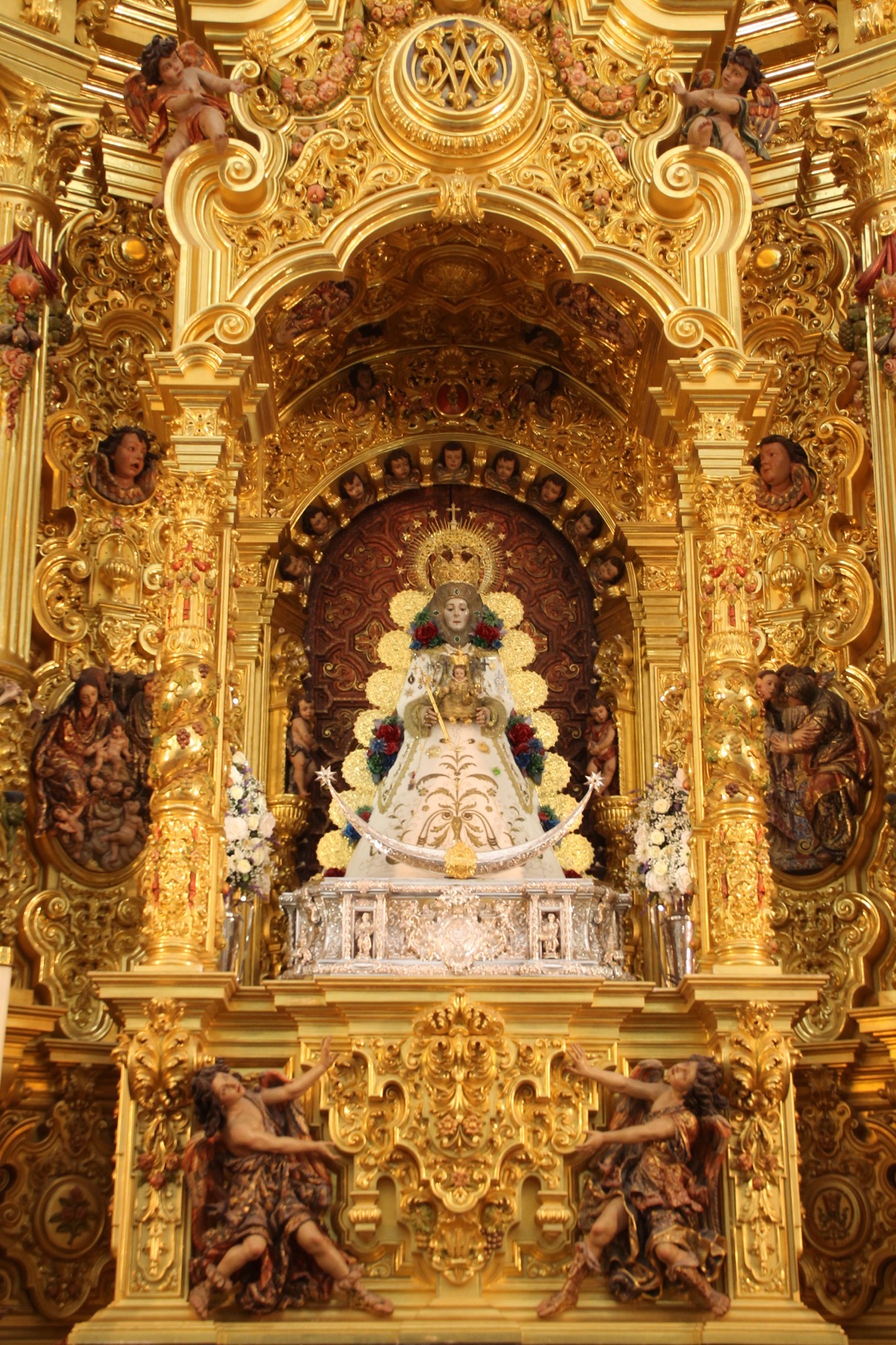 En la pasada madrugada, las camaristas de la Virgen procedieron a vestir la Imagen de la Stma. Virgen, con motivo de la celebración el próximo fin de semana de la festividad de la Candelaria. La Virgen luce la saya donada a mediados del pasado siglo por la familia Cepeda, con diseño de Joaquín Castilla. Esta saya es conocida popularmente como de “la garrapata” por la forma del dibujo de sus bordados. Las flores son ramilletes donde predominan las rosas en tonos rojos, verdes y azules metalicos. El Pastorcito luce el traje donado por la asociación de vecinos de El Rocío, el cual fue entregado este año cuando los Reyes Magos de la Aldea visitaron el Santuario para adorar al Niño. El próximo fin de semana, se celebrará la Fiesta de la Luz o Candelaria, con el recibimiento de las dos nuevas Hermandades Filiales, Torrejón de Ardoz y Salteras, a las 20:00 h. del sábado 31 de enero, la Vigilia Mariana a las 21:00 h. y a su finalización, el Santo Rosario, que se rezará cantado y en procesión por el recorrido tradicional. El domingo 1 de febrero por la mañana, se celebrará la Santa Misa a las 10 h. y a las 12 h tendrá lugar la presentación de los niños a la Stma. Virgen.