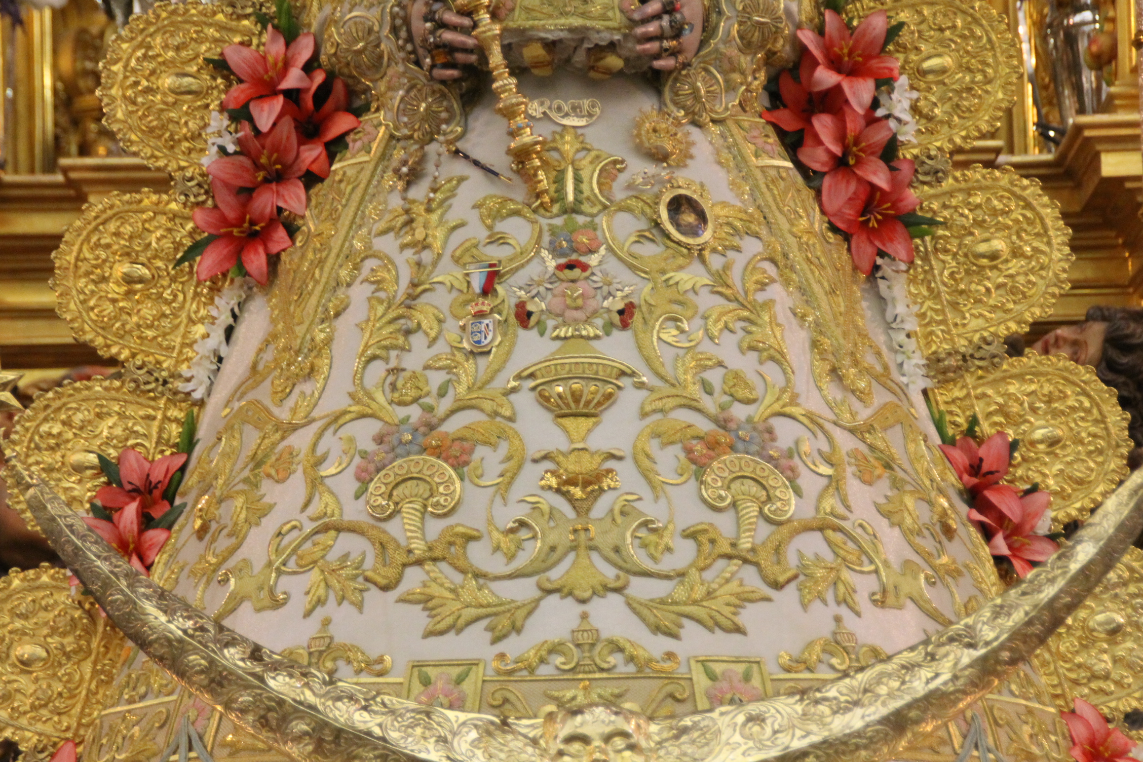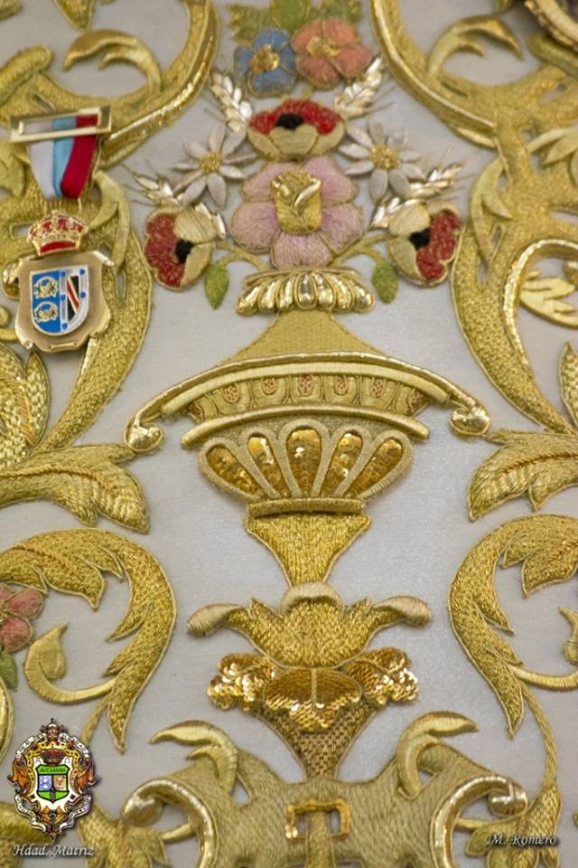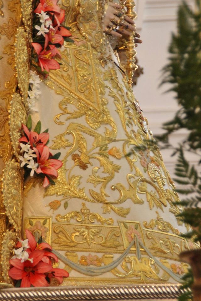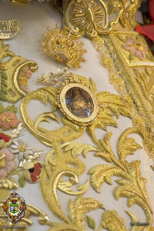 El traje que llevará la Virgen, se acompaña con el manto de Pentecostés, realizado también en Santa Bárbara, en 2011, con diseño y bordado muy similar al nuevo traje, que fue bendecido la pasada Navidad en el Santuario.
