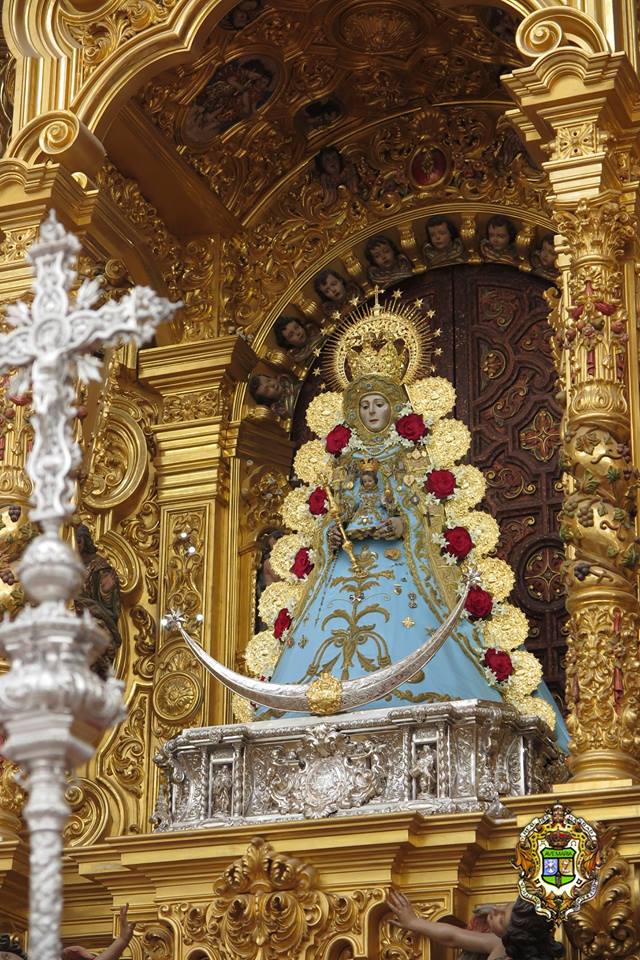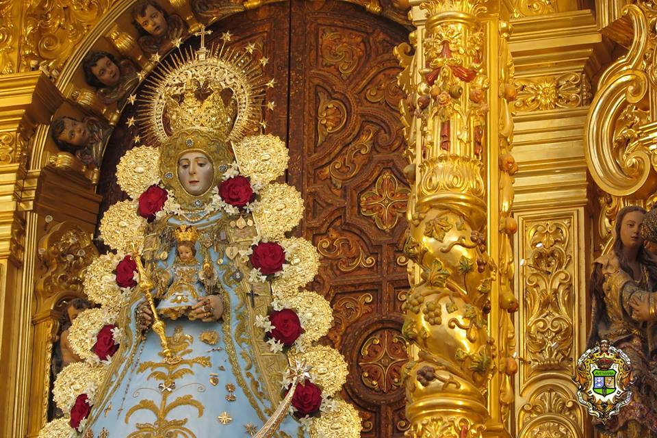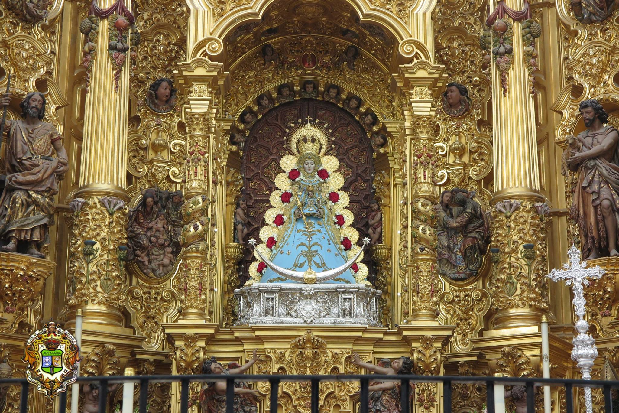 La Virgen presenta el juego de ráfagas de punta de martillo, corona y media luna de plata, diseñada y donada por Joaquín Castilla, en 1965. Las flores que lleva son rosas rojas y orquídeas dendrobium blancos.