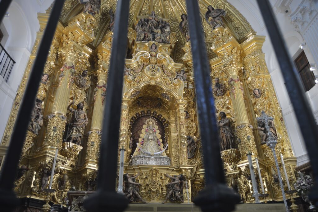 La Virgen porta el cetro “de las Marías”, y luce un rostrillo elaborado por Javier Anguas, con joyas donadas por devotos. El dorado, ligado a la divinidad en el cristianismo, resalta en las ráfagas y la media luna. Y el exorno floral está compuesto por ramilletes de rosas en tonos compañeros a la saya de la Blanca Paloma, en tonos malvas, rosas y dorados.