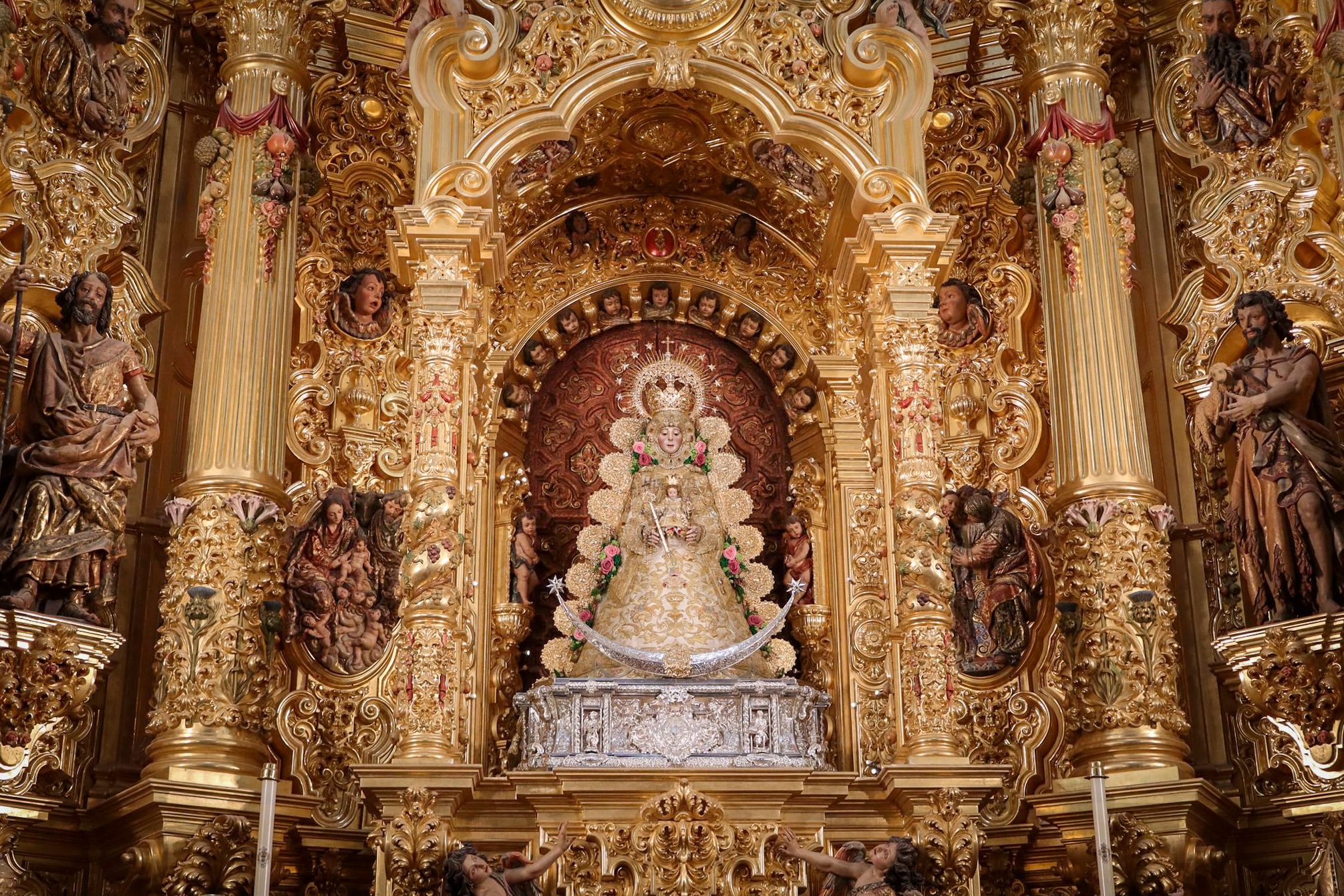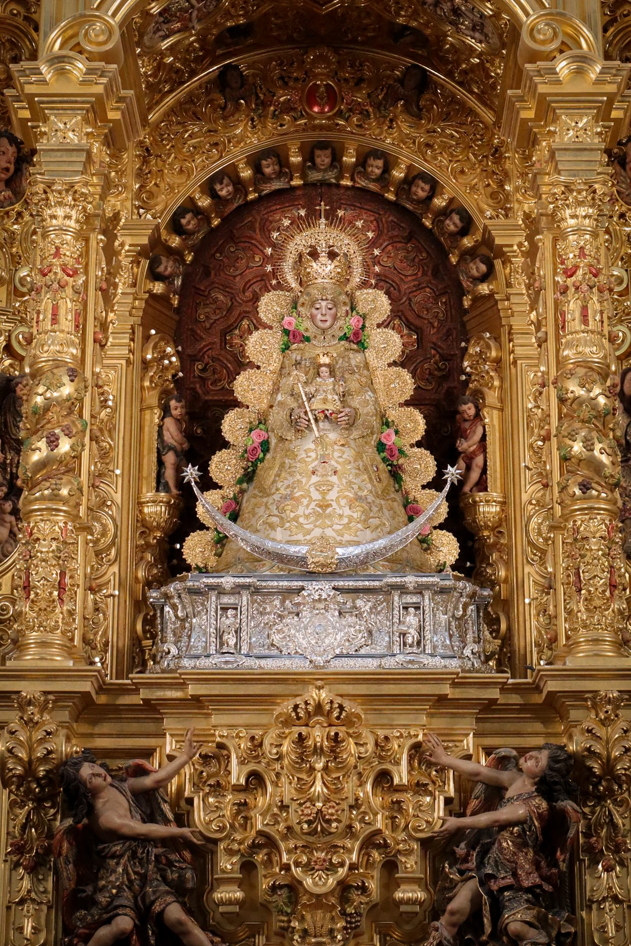 La Virgen porta el cetro “de las Marías”, y luce un rostrillo característico por sus topacios. El dorado, ligado a la divinidad en el cristianismo, resalta en las ráfagas y la corona. La media luna a sus pies, es plateada con el escudo de la Matriz. El exorno floral está compuesto por rosas preservadas, acompañadas de flores secas. El Pastorcito lleva una corona, regalo de los Reyes Magos de La Palma del Condado, de 1949.