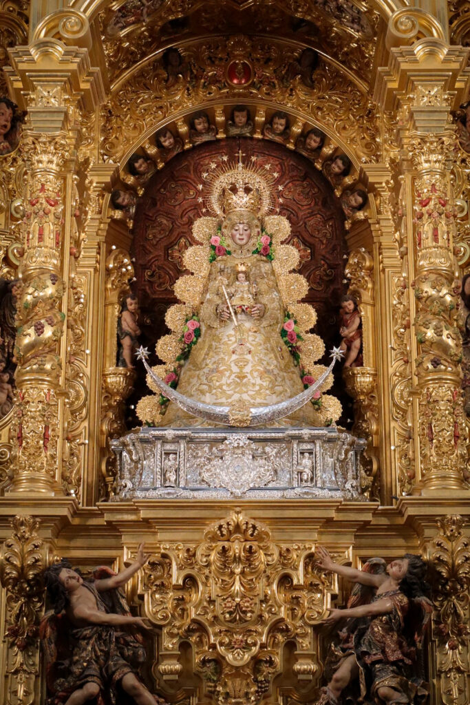 La Virgen del Rocío ha amanecido en este miércoles entronizada de nuevo en la peana de su camarín. La Patrona de Almonte y su Niño visten a juego el traje confeccionado en 2015 por el taller de bordados de la Hermandad Matriz; con el manto del traje conocido como “de Pentecostés”, bordado en el taller de Santa Bárbara en 2011.