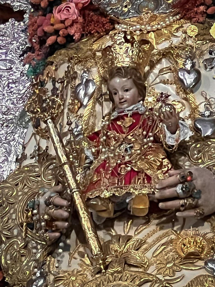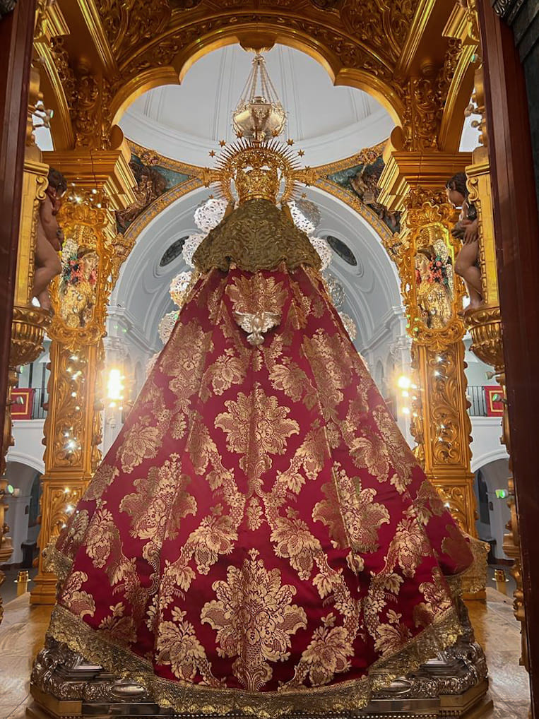 A las puertas de celebrar su Nacimiento, el Pastorcito viste su traje rojo. La Virgen del Rocío luce, a juego con el Niño, el manto del mismo color.