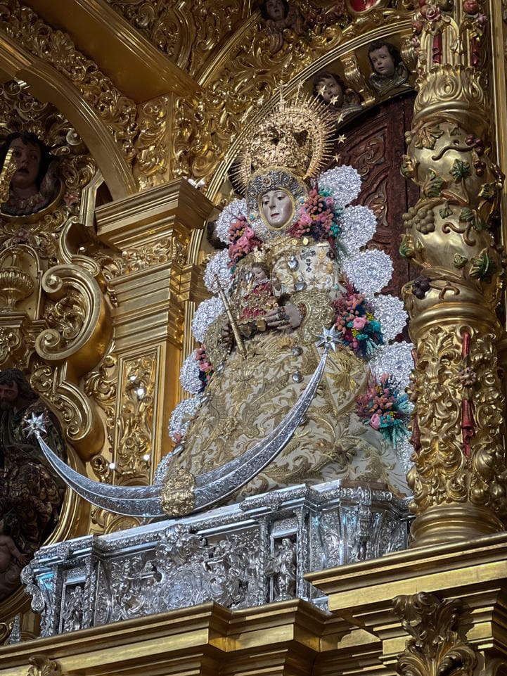 Ntra. Sra. luce en su hombro izquierdo, el Lazo Blanco de platino y brillantes que el Foro del Rocío le regalara en el año 2003.