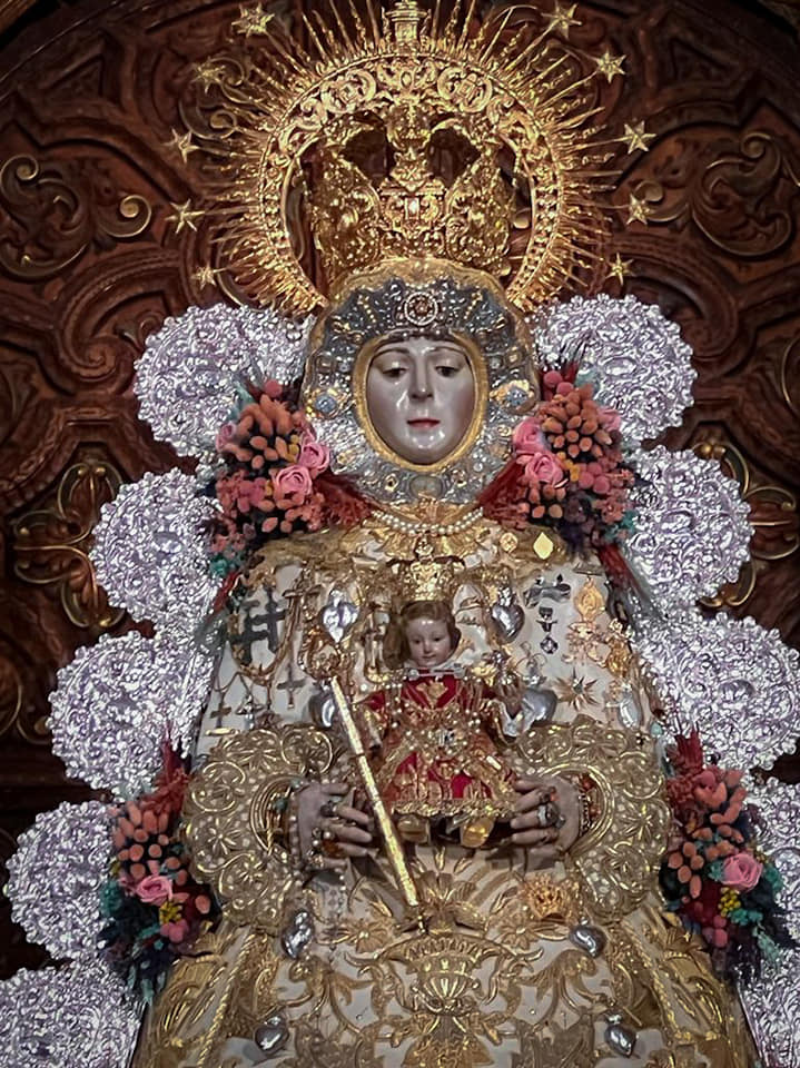La exornan ramilletes de flores preservadas y secas, teñidas. Y porta la Virgen el cetro conocido como «de las Marías».