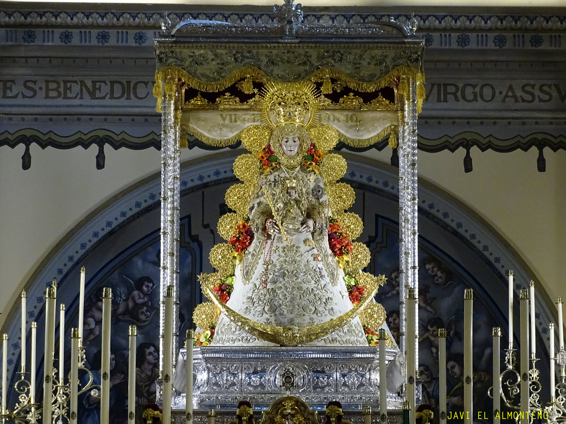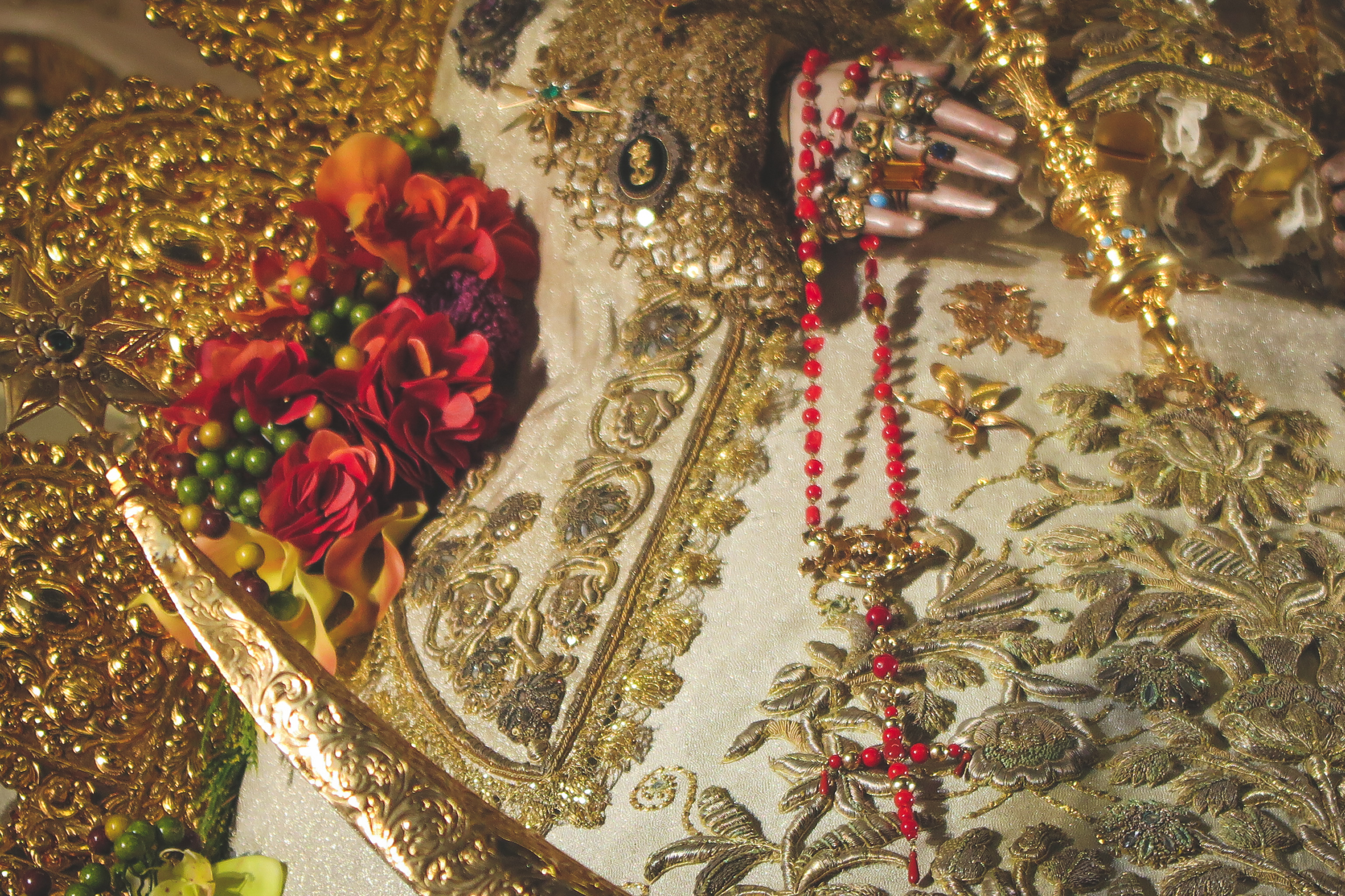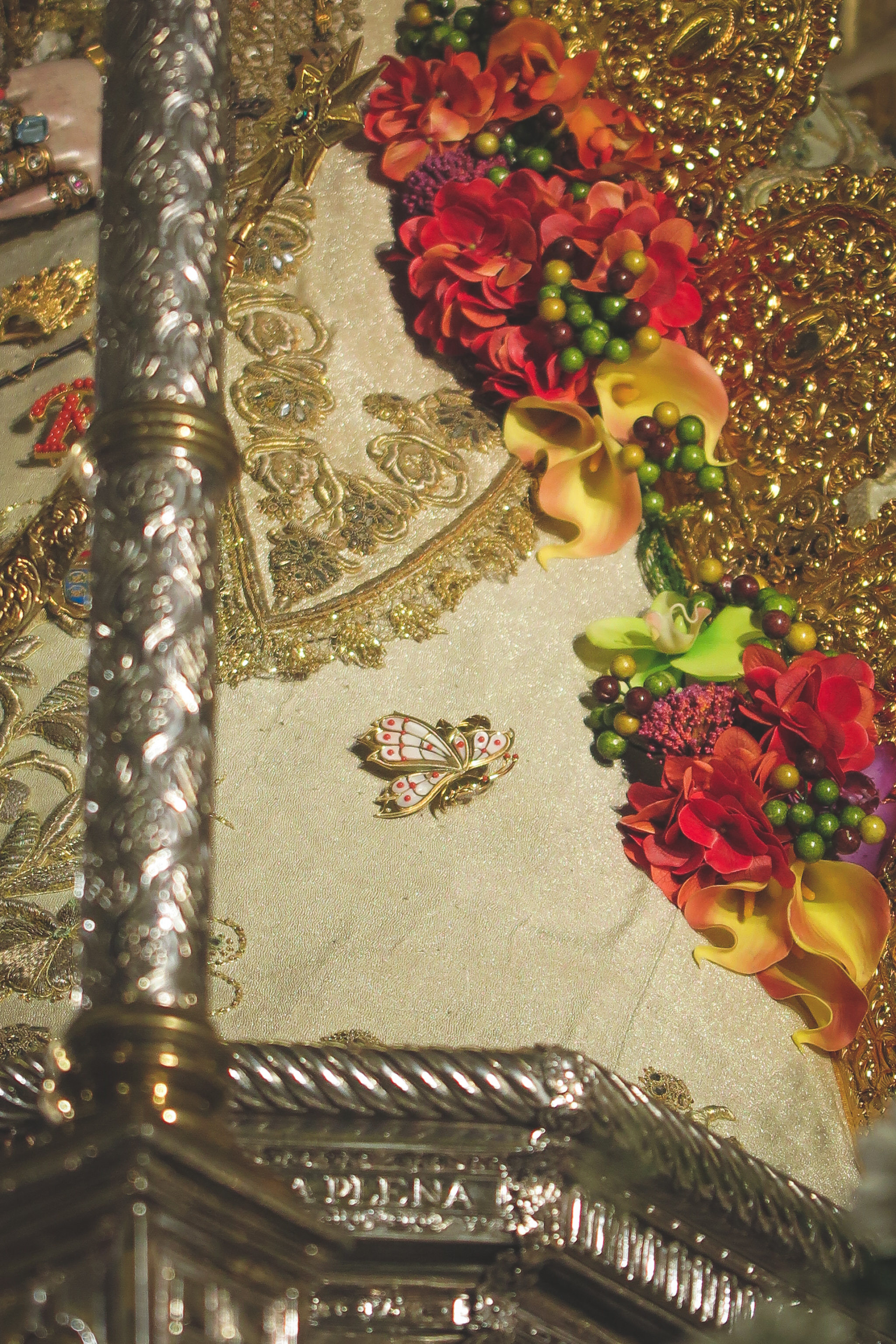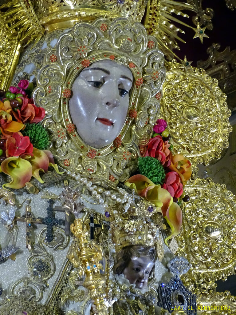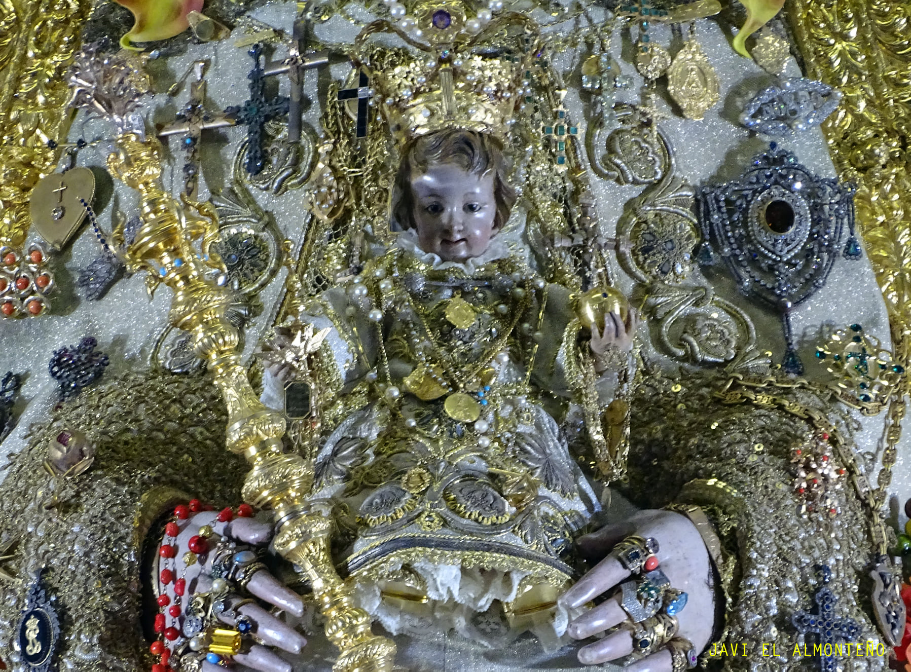 Las hermanas camaristas la han vestido con este histórico traje que la Virgen ha llevado en ocasiones tan importantes como su coronación canónica o la visita de S.S. San Juan Pablo II. El Pastorcito viste a juego, el traje restaurado en el taller de la bordadora Rocío Peláez Raposo, recientemente fallecida.