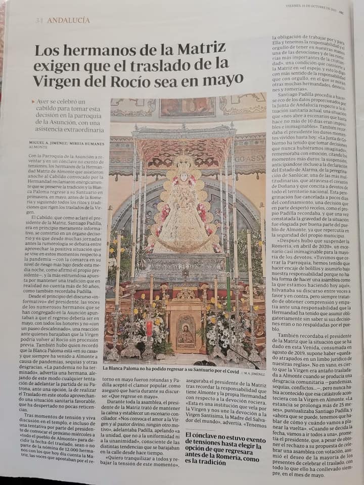 El pueblo de Almonte congregado en el Cabildo Extraordinario ha decidido que la Virgen del Rocío permanezca en la Parroquia de Nuestra Señora de la Asunción hasta el mes de mayo de 2022.