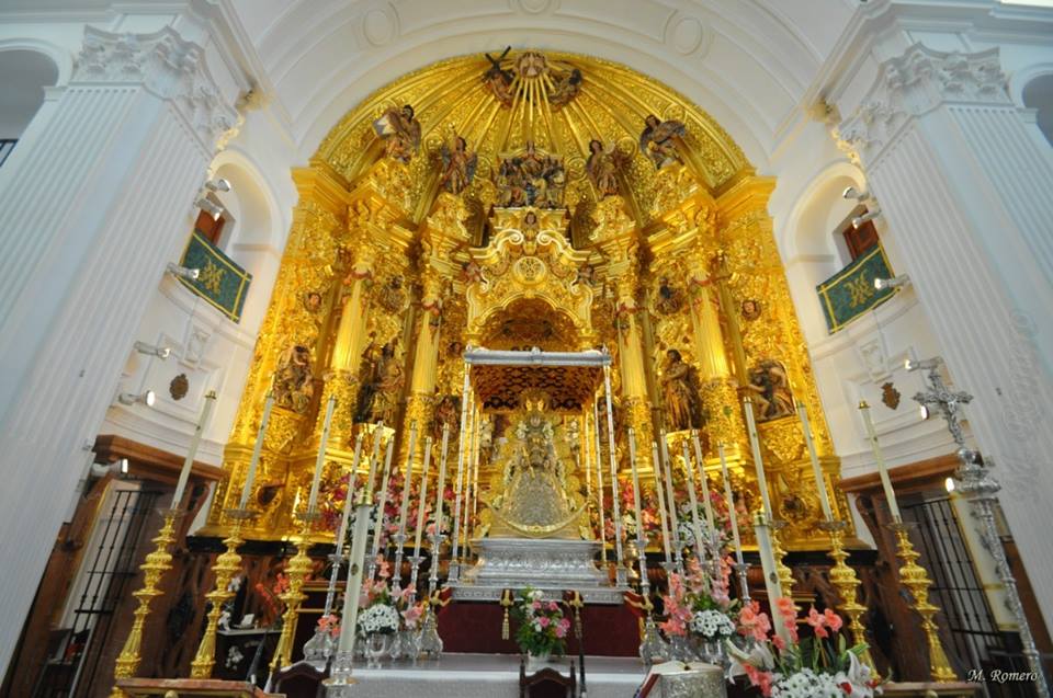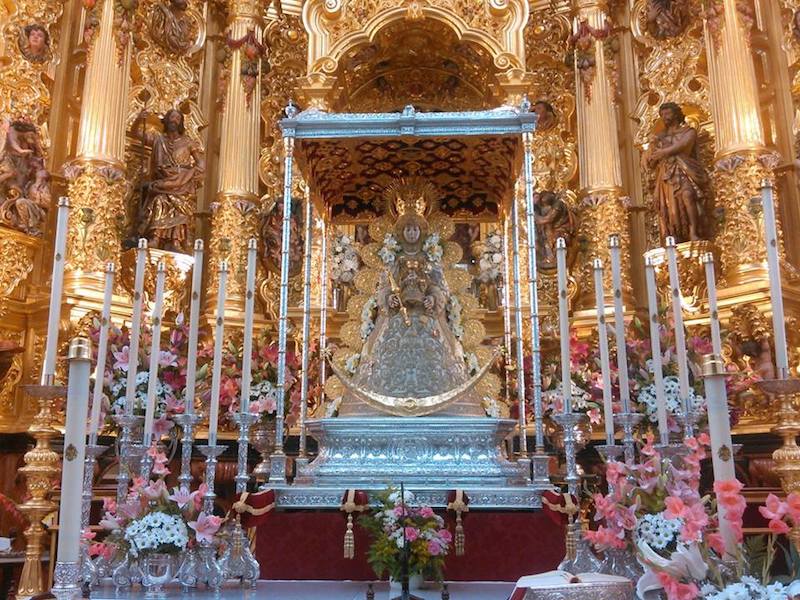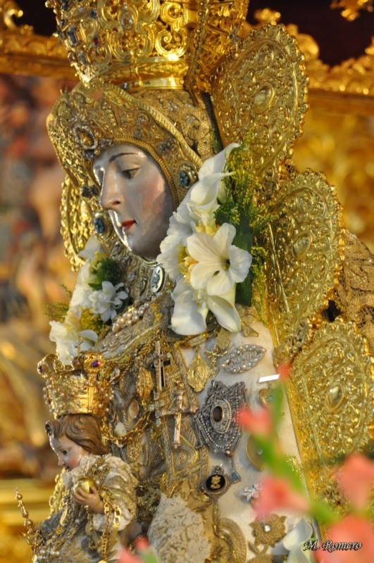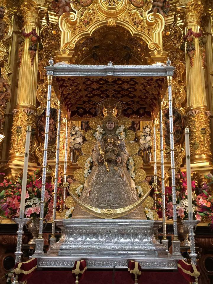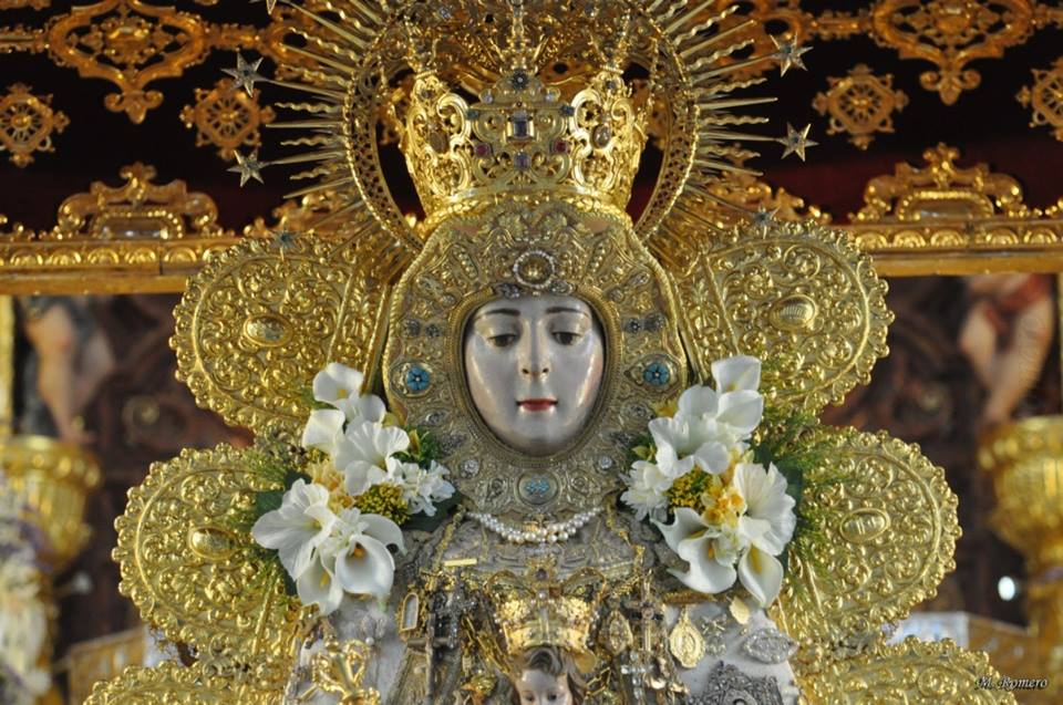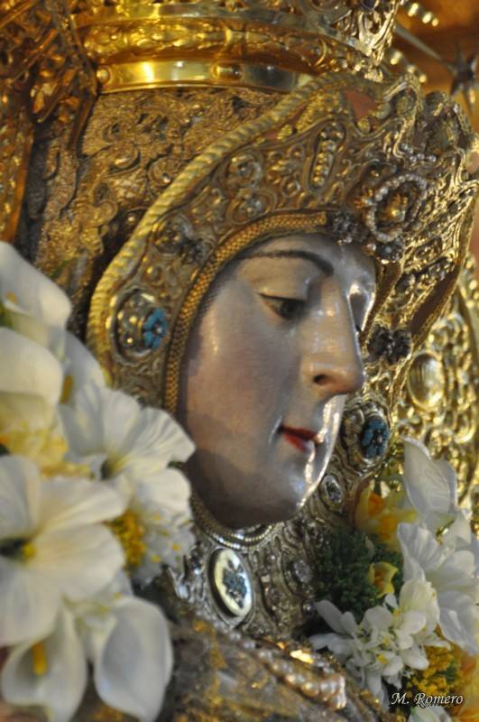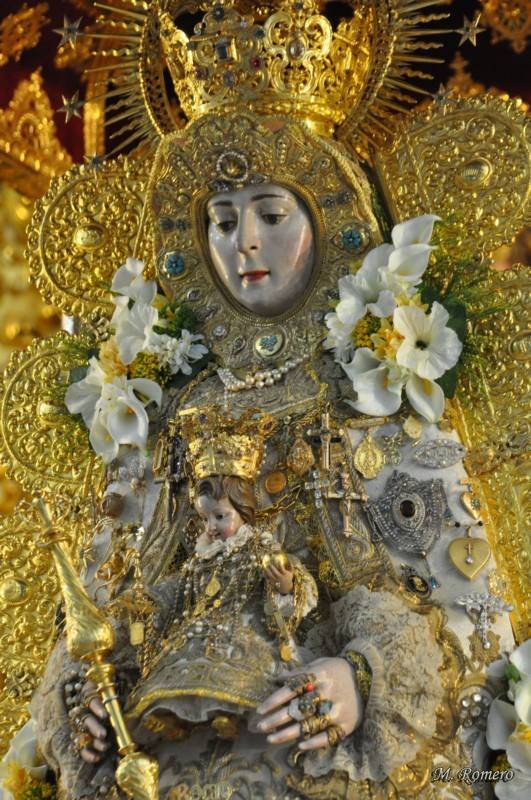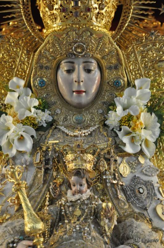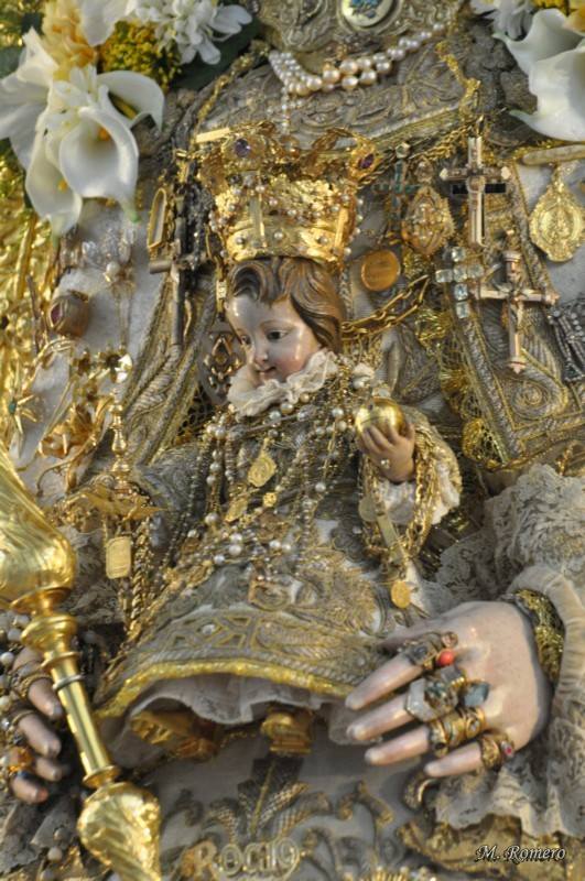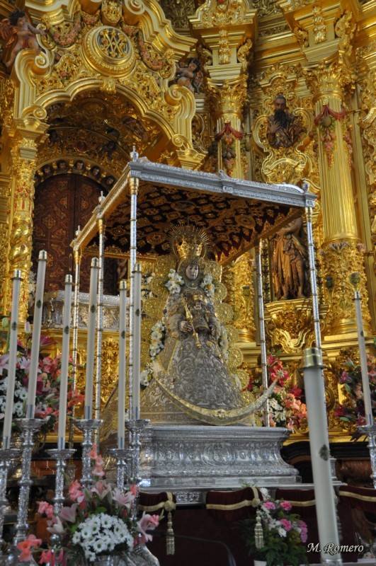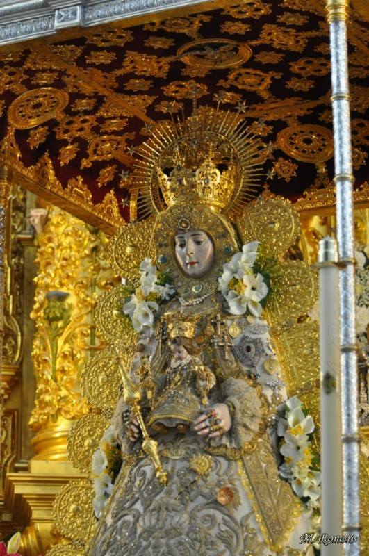 En la pasada madrugada, las hermanas camaristas, procedieron a entronizar en su paso procesional, la Imagen de la Stma. Virgen del Rocío, que luce el traje y el manto conocido como de los Apóstoles, o de las hermandades. Lleva también el rostrillo de Muñoz y Pabón y la toquilla que fuera diseñada, como todo el traje, por Joaquín Castilla. Como novedad en esta ocasión, cabe destacar los puñitos que luce la Virgen que fueron donados por la Hdad. de Albaida del Aljarafe el pasado febrero, con motivo de su nombramiento como Hdad Filial. Las flores que acompañan al vestido son en tonos blancos y amarillos, en recuerdo y homenaje del ya Santo Juan Pablo II, recientemente canonizado y quien fuera el Papa que visitara el Santuario del Rocío, el 14 de junio de 1993. Así podrá ser venerada por sus devotos hijos desde esta mañana y durante la romería 2014. Notas de la Hdad. Matriz