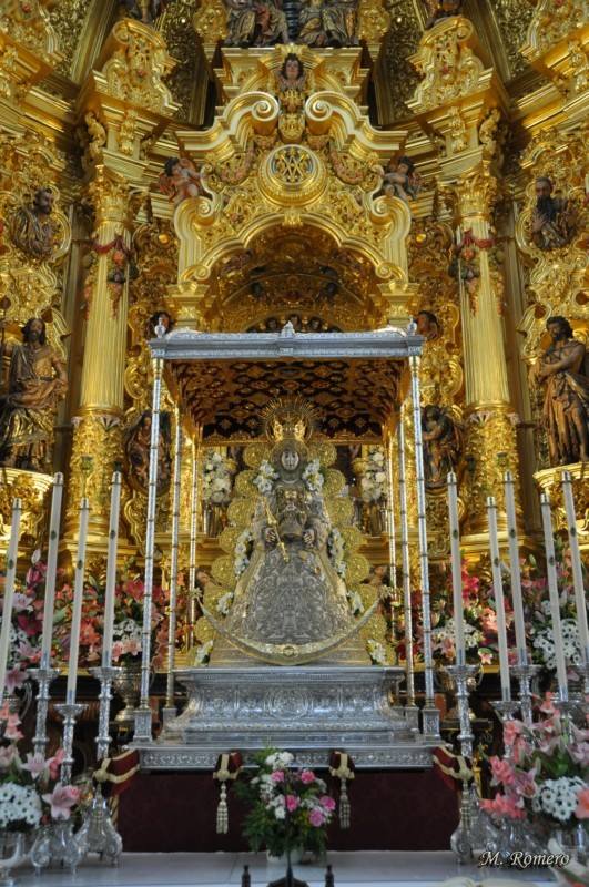 La Virgen del Rocío ya está en su paso para procesionar en la Romería del 2014. Durante esta noche las camaristas de Ntra. Sra. han preparado a Ntra. Sra. para su porcesión en la madrugada del lunes de Pentecostés. El manto que lleva es el llamado de «Los Apóstoles» o de las «Hermandades».