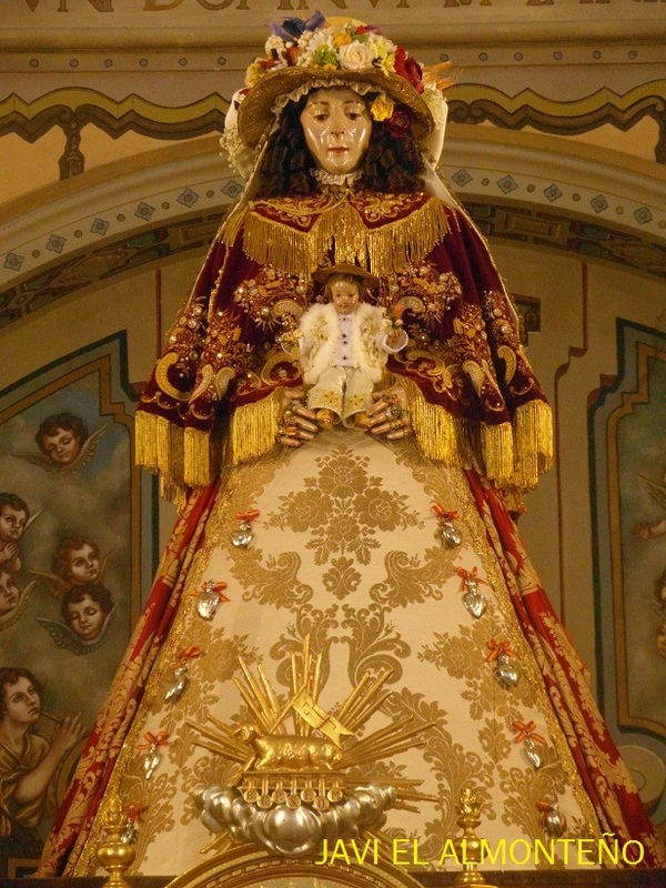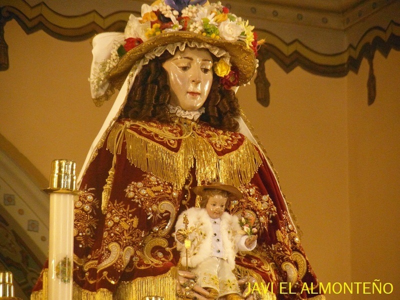Aunque con las novedades del sombrero de la Virgen y el traje del Pastorcito, luce el traje de Pastora que estrenara el pasado agosto, para su Traslado hasta Almonte, obra del diseñador José Manuel Vega Morales, con manto confeccionado en seda roja, brocado con hilo de metal en oro, basado en los brocados antiguos y medido en el ancho del s. XIX, saya realizada en seda blanca con brocado en hilo de metal de oro viejo y esclavina es réplica de la antigua del s. XVIII que se confeccionó hace 7 años y que ya llevara la Virgen en el anterior traslado.
