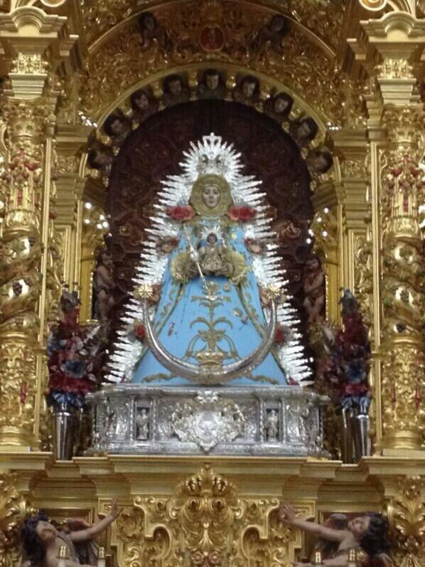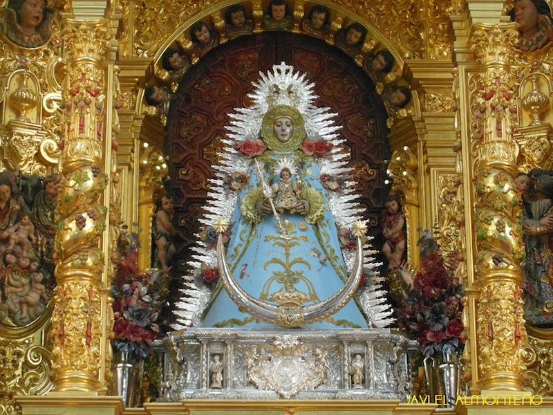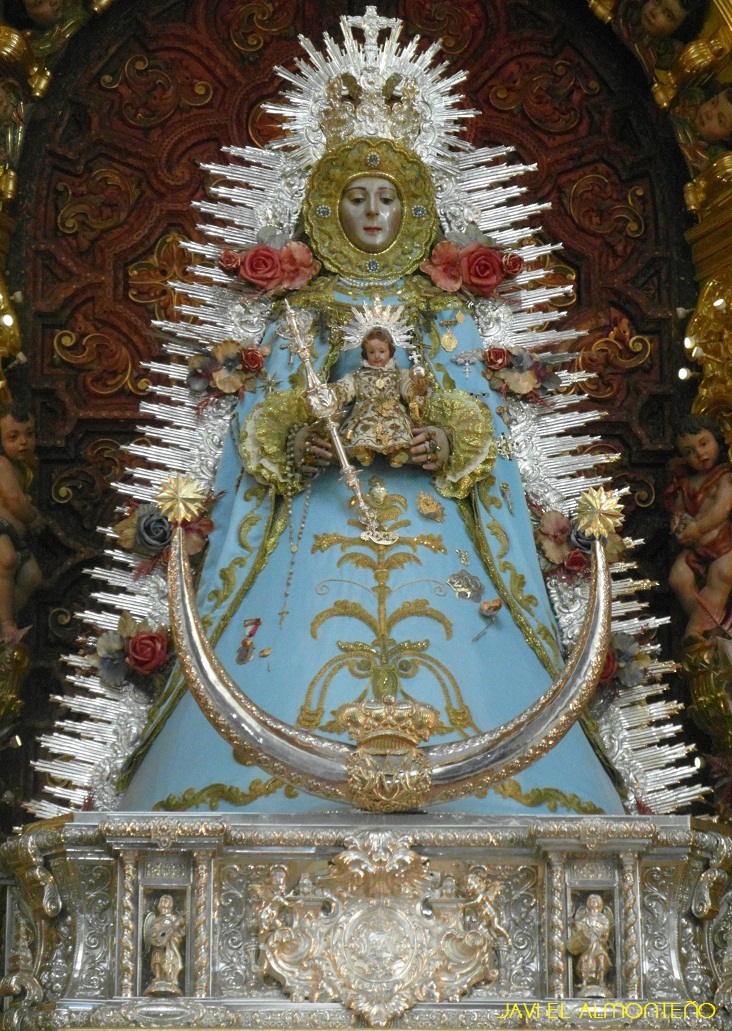 Hoy 2 de diciembre, la Virgen amanece vestida con el traje conocido con el de la Inmaculada. Fue regalado por la Hermandad Matriz de Almonte, en el 1989, el traje de seda celeste fue bordado por los Hermanos Benítez en Sevilla. En los 90 se paso el bordado a una tela de tisú con hilos dorados y fondo celeste. En 2011 se paso nuevamente el bordado a seda celeste, retocándose en las Sobre – Mangas.El niño esta ataviado con un traje blanco y dorado, un cambio acertado al resaltar en color del traje con el de la madre.