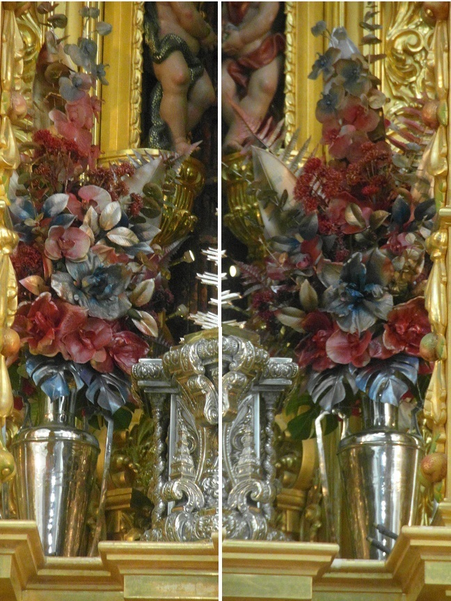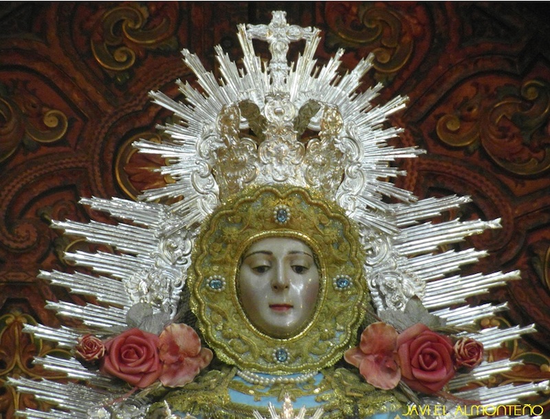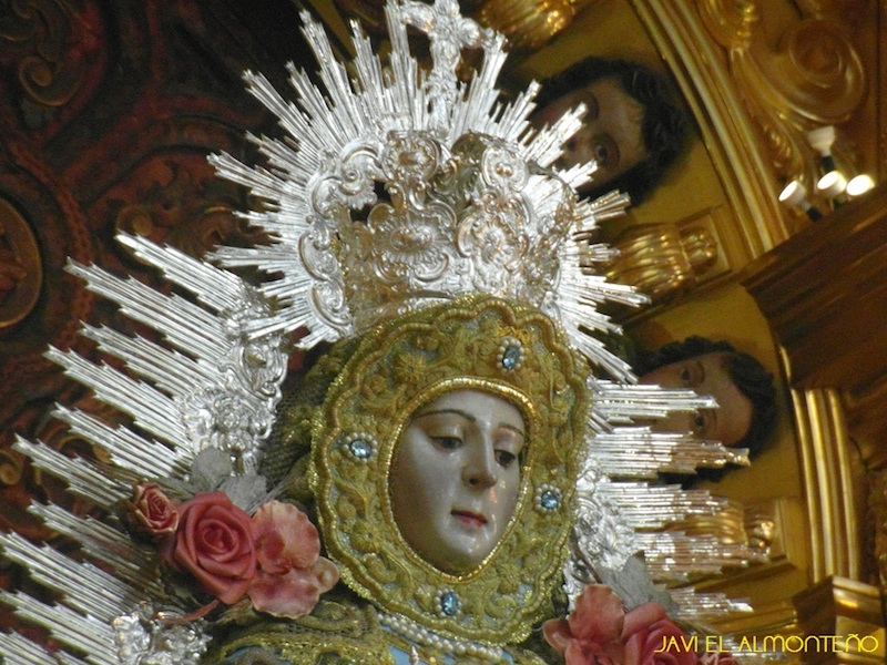 La imagen luce las llamadas ráfagas de rayos de plata del siglo XIX, a juego con las coronas, media luna y cetro. Las flores optadas para lucir la Virgen son rosas orquídeas y espigas en tonos rojos y azules mezclados con dorados, plata y algún toque en cobre, en semejanza a las flores de talco. En el camarín y a ambos lados de la Virgen, adornan dos ramos de flores a juego con el de la Reina de las Marismas. (Javi el almonteño – Miembro del Foro)
