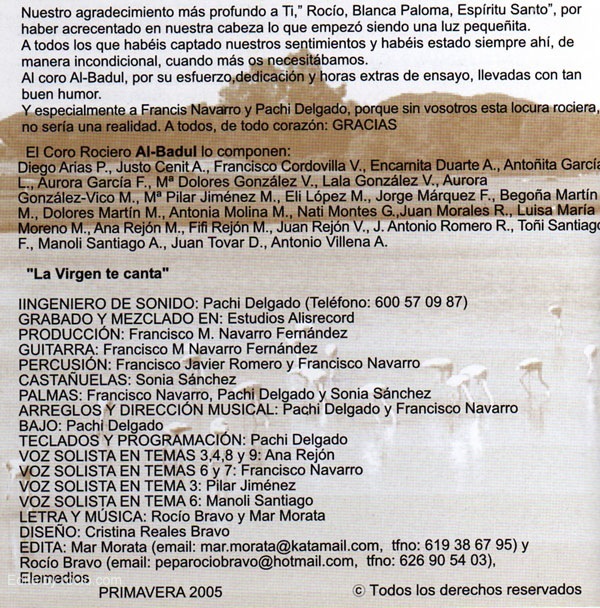 Ninguna de las autoras nos dedicamos a la música, ni a nada que tenga que ver con esta profesión; es más, este disco es lo primero que componemos. Lo hemos hecho sólo por devoción a la Virgen, y pedimos al coro Al-Badul de Padul (Granada) que pusiera las voces.