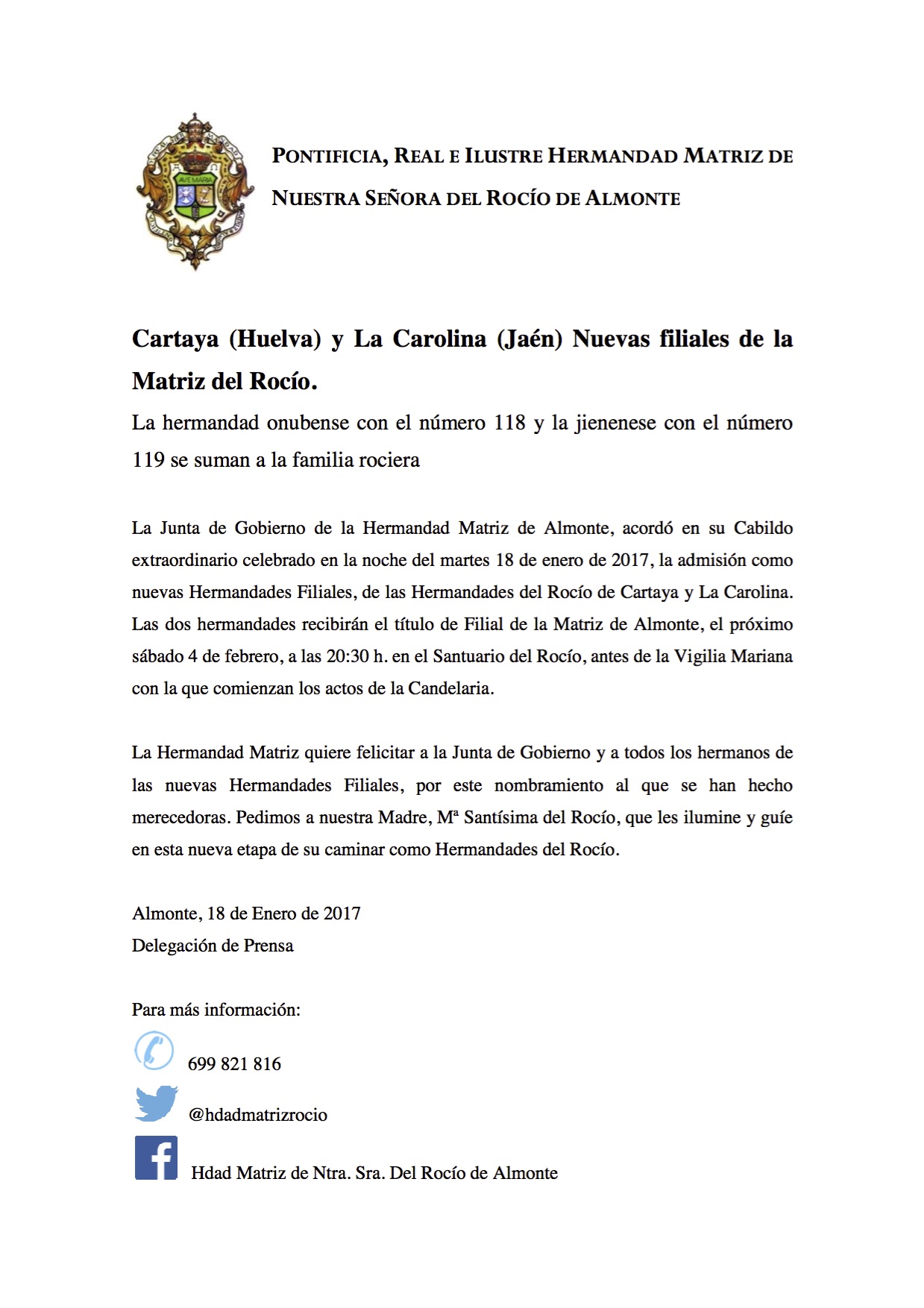 Las Hermandades de Cartaya y La Carolina Nuevas Filiales, con los números 118 y 119