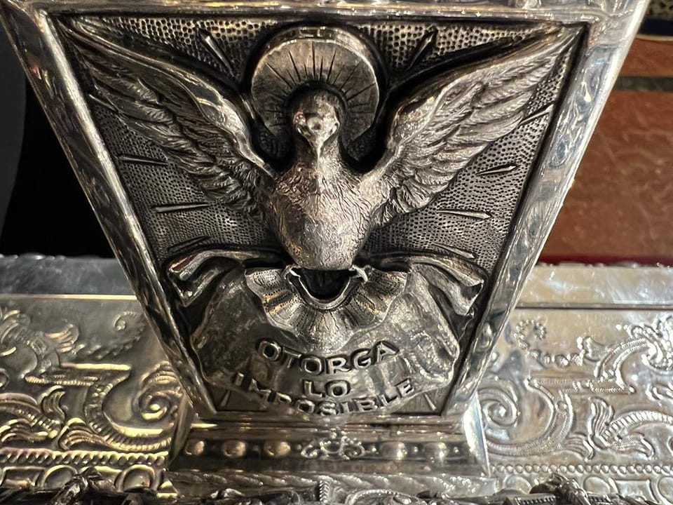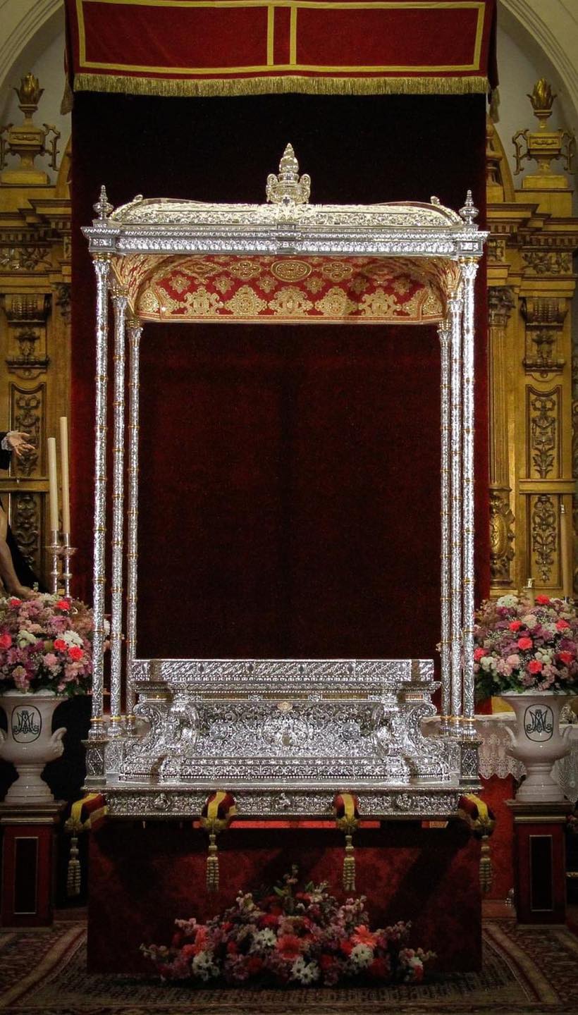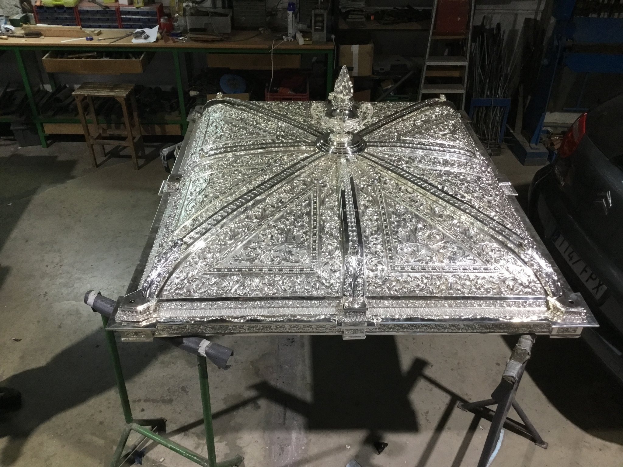 El pasado día 7 de mayo se bendijo en la Parroquia de Ntra. Sra. de la Asunción de Almonte, el nuevo Paso de Ntra. Sra. del Rocío. Del cual ORFEBRERÍA VILLARREAL, S.A. ha realizado toda la orfebrería del techo en plata de ley. Consiguiéndose de esta forma, junto con la estructura interior realizada por INESPASA, reducir su peso muy considerablemente. En lo que respecta al terreno artístico, se ha respetando el diseño anterior del techo de Palio y se ha enriquecido la ornamentación en cuanto a relieve y depuración en su dibujo.
