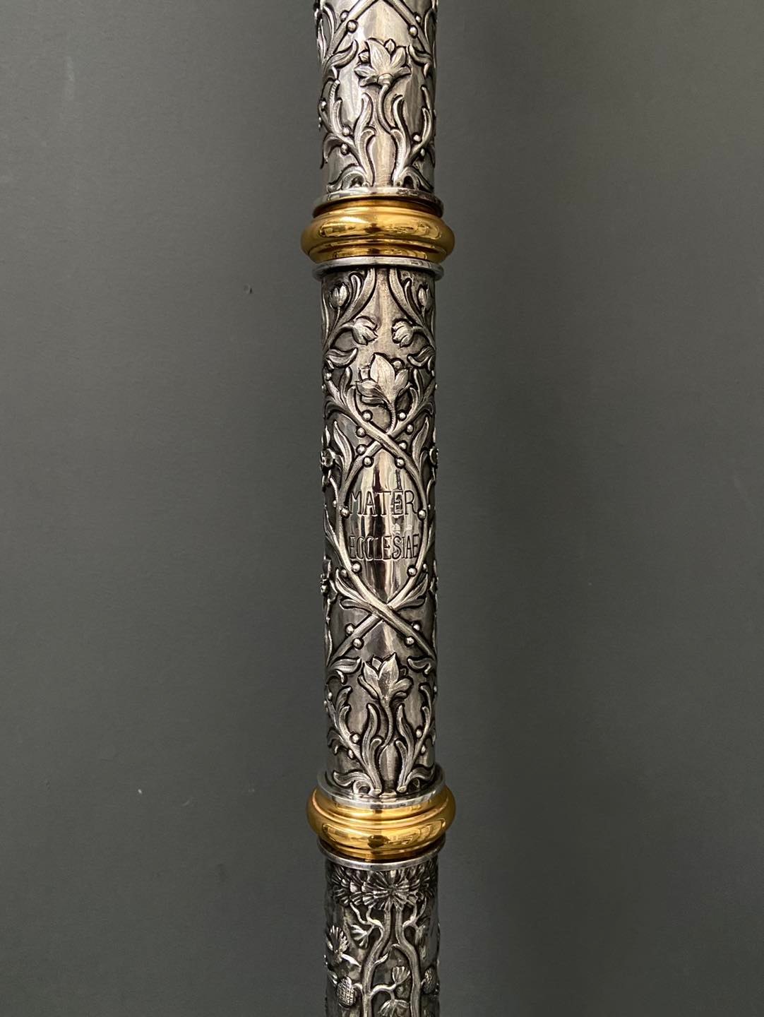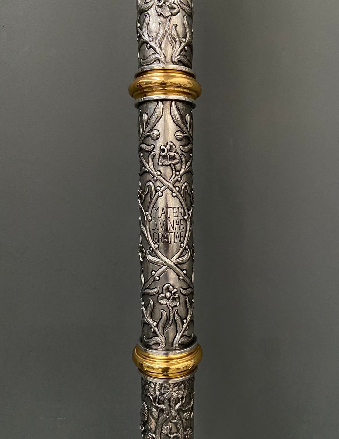 Las flores elegidas para estos tubos son la amapola, símbolo del consuelo y la esperanza; la margarita, símbolo de la inocencia y la pureza; el narciso blanco, el cual, con su forma de trompeta, alude a la función de la transmisión del mensaje de Dios; la orquídea, símbolo de la armonía y la perfección espiritual; el lirio, símbolo de la luz y representación de la Santísima Trinidad; y la rosa silvestre, con infinidad de simbolismos, que se ha elegido por su vinculación con el Santo Rosario (Corona de Rosas). Todas representan un canto a las virtudes de la Santísima Virgen, a la vez que también simbolizan la tradicional forma de exornar con flores las andas y tronos de las imágenes sagradas. En nuestro caso, ya que sus andas procesionales no llevan flores naturales durante la procesión del Lunes de Pentecostés, la ausencia de aquéllas se suple con estas flores labradas en la plata de sus varales.