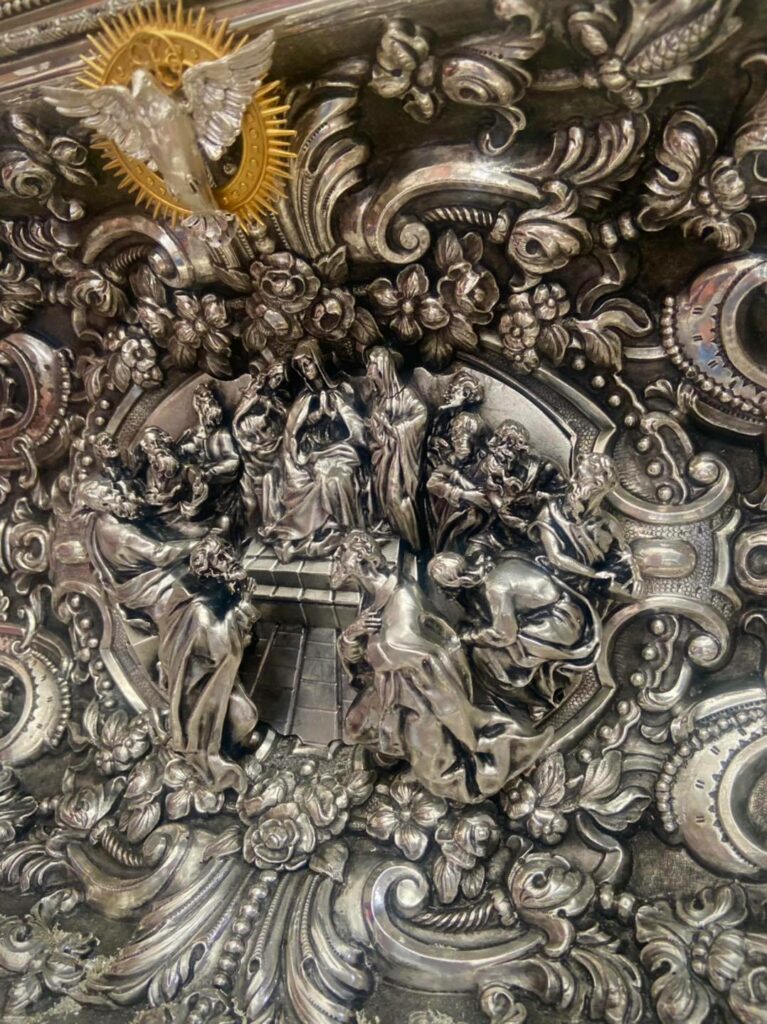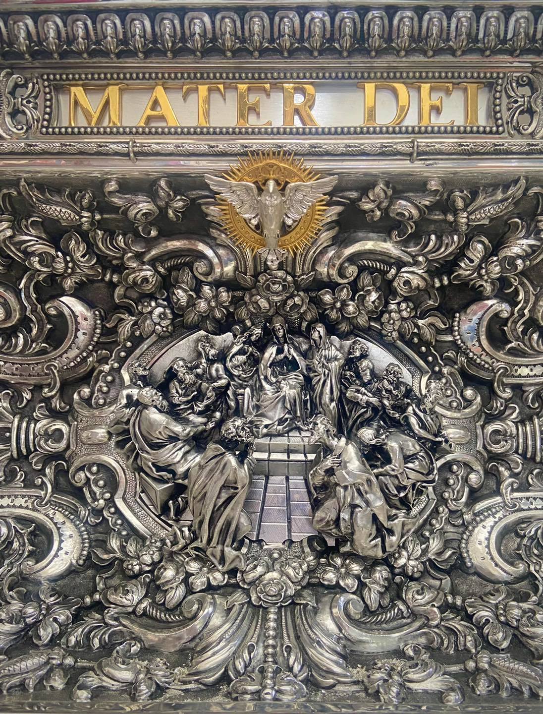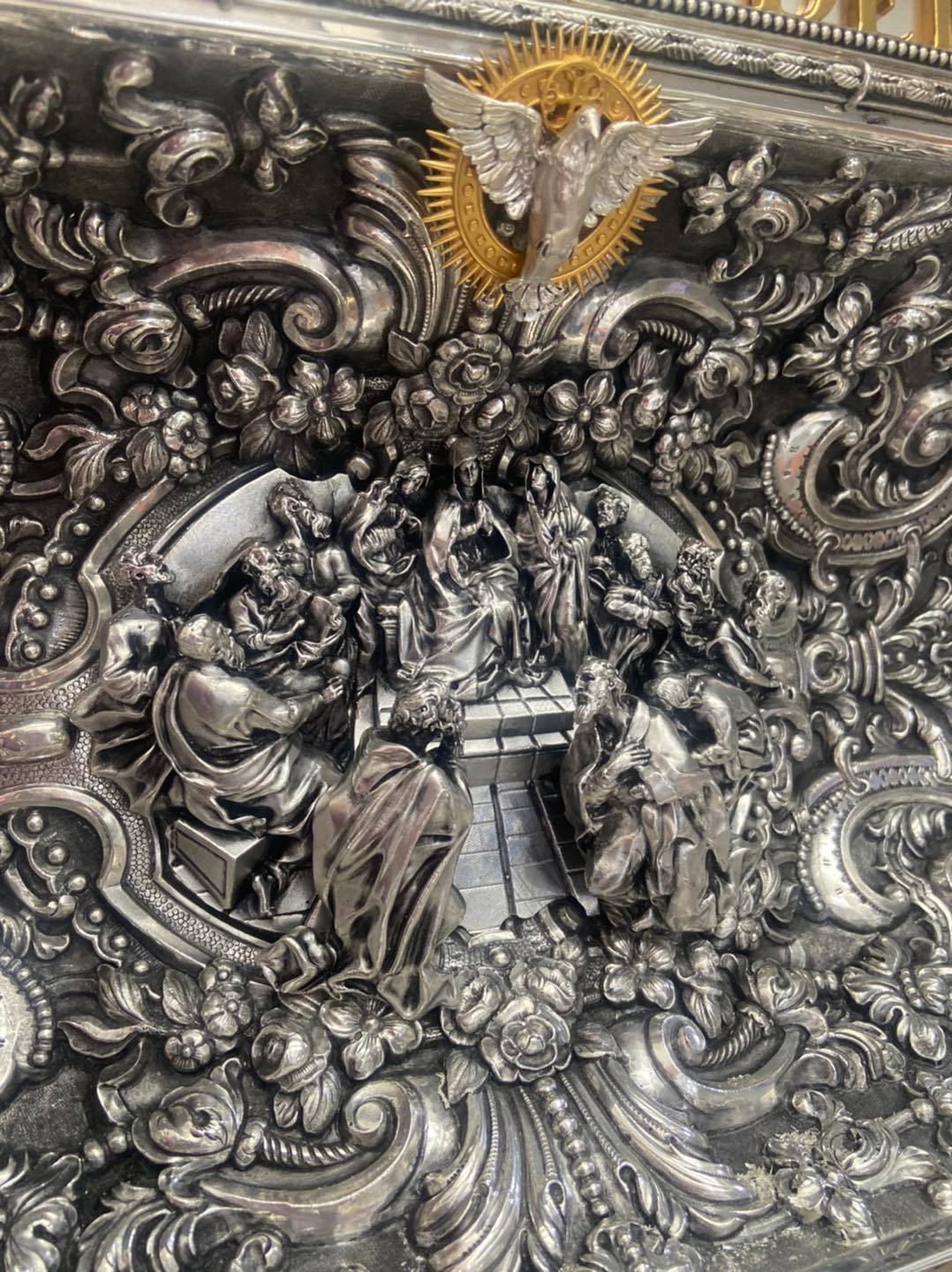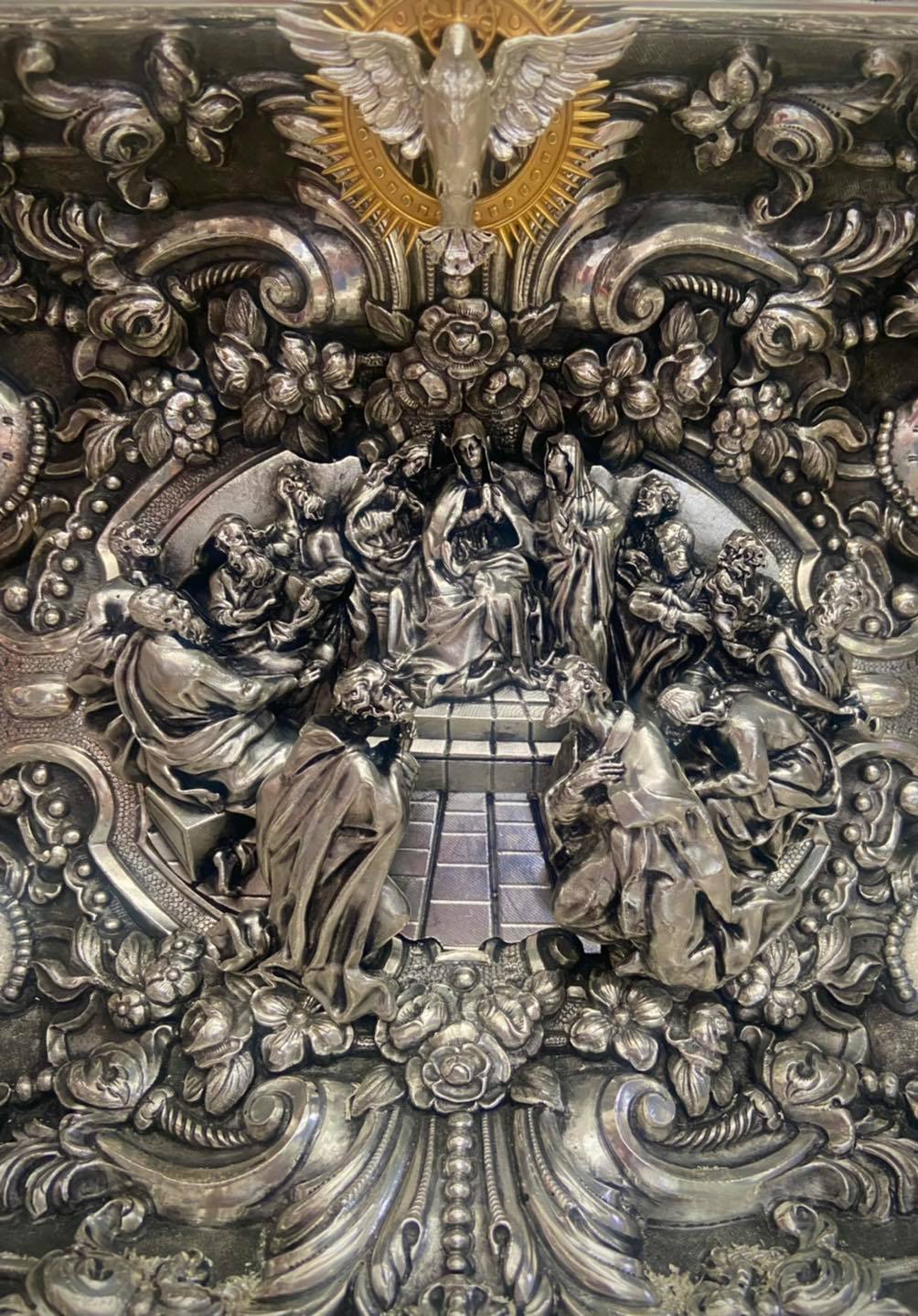 En el frente la escena de Pentecostés, donde María reunida con los Apóstoles son sorprendidos por un viento recio y lenguas de fuego que se posan sobre cada uno de ellos recibiendo así los dones del Espíritu.