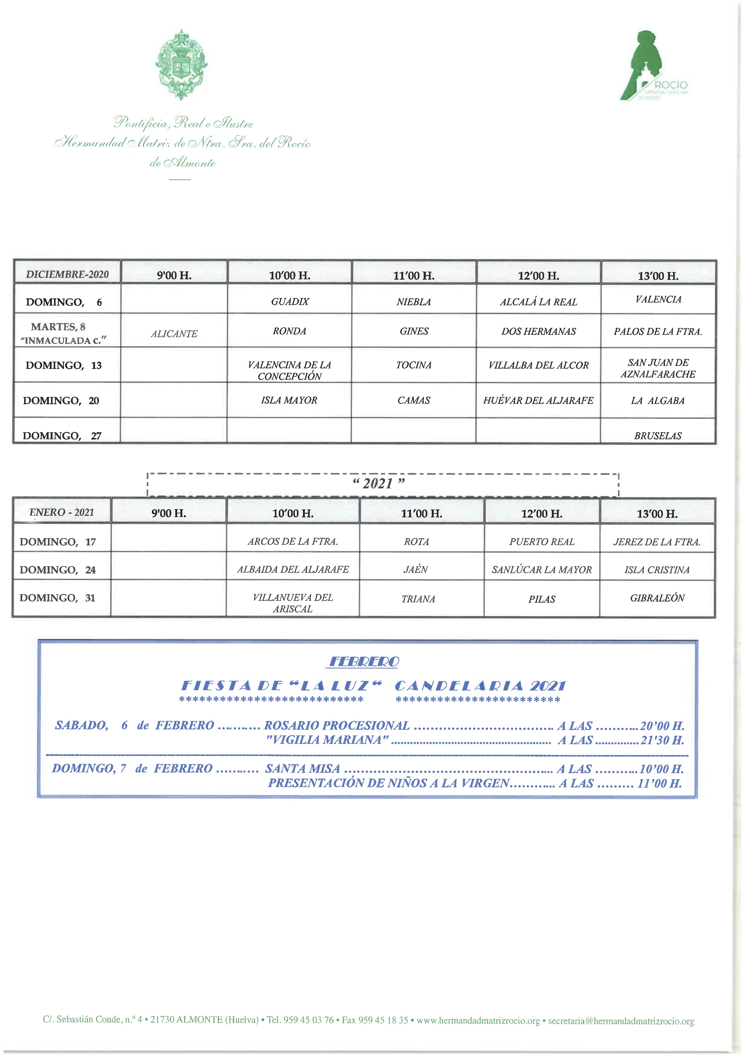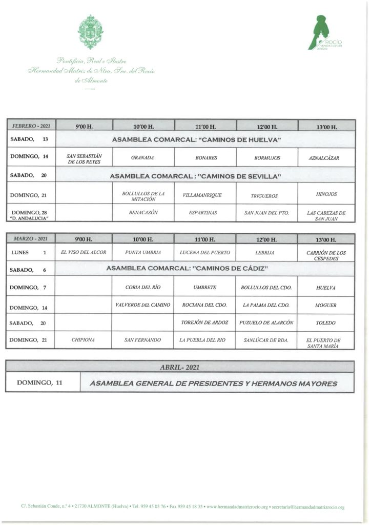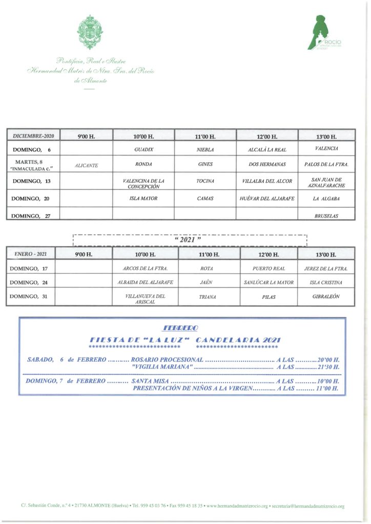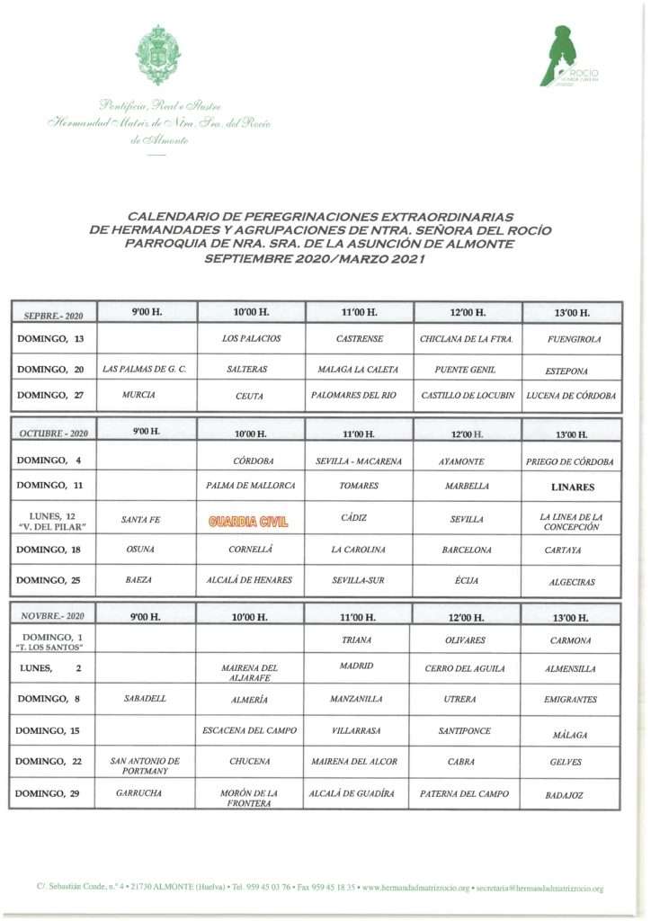La Hermandad Matriz confirmará a cada hermandad filial, un mes antes, por correo electrónico y por teléfono, su peregrinación a la Parroquia de Ntra. Sra. de la Asunción de Almonte. De acuerdo con lo establecido en el Calendario de Peregrinaciones Extraordinarias de Hermandades del Rocío 2020/2021. Aquella que no pueda venir en la fecha establecida en el mismo, lo hará en el calendario del año siguiente. No cabe, por tanto, el aplazamiento.