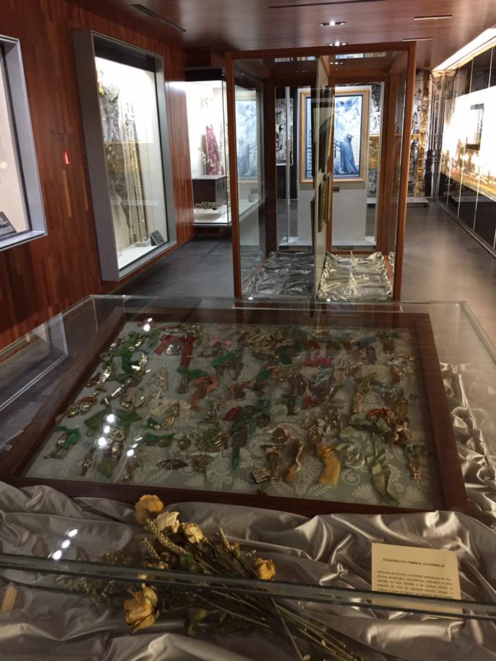 De hecho, al «cuarto de los milagros» de la Virgen del Rocío llegaban cientos de objetos que eran depositados directamente por los fieles en los escasos huecos que quedaban, podían observarse todo tipo de elementos representativos de su fe o del favor que la Virgen hubiese concedido al devoto. Había de todo, «lo mismo cuadros que piernas ortopédicas, trajes de bautismo, de boda, de comunión, mortajas, muletas, trenzas de pelo natural…», desgrana el director del Tesoro. «Lo que allí imperaba era el horror vacui, el miedo al vacío; no había un espacio libre porque todos los iban rellenando los devotos», describe.