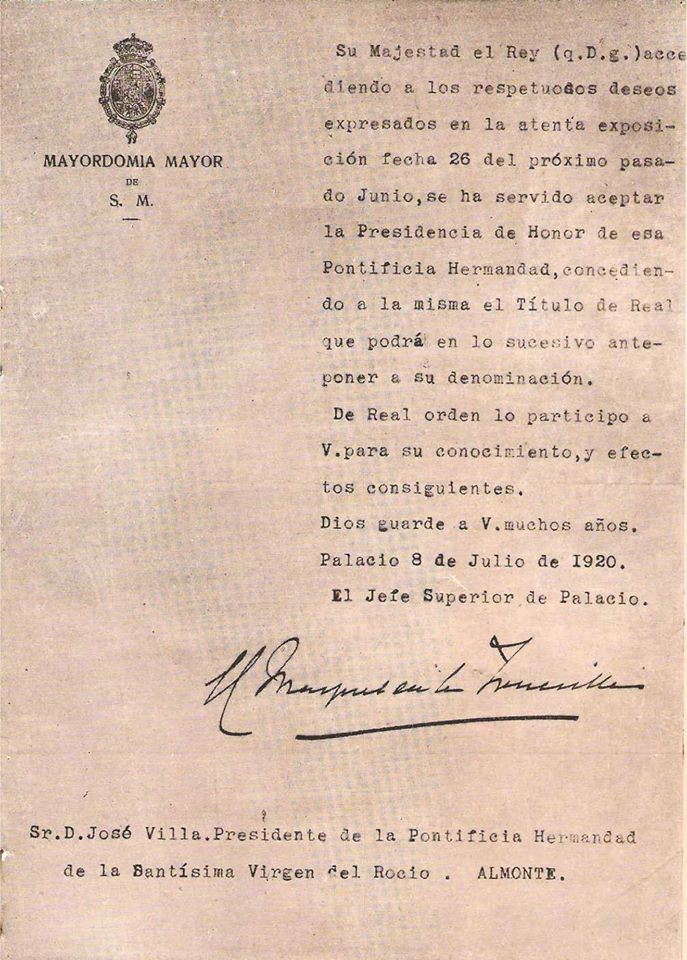 Título de Real para la Hermandad Matriz de Almonte. Concedido por el Rey Alfonso XIII el 8 de julio de 1920.