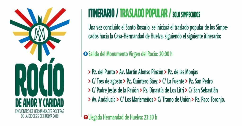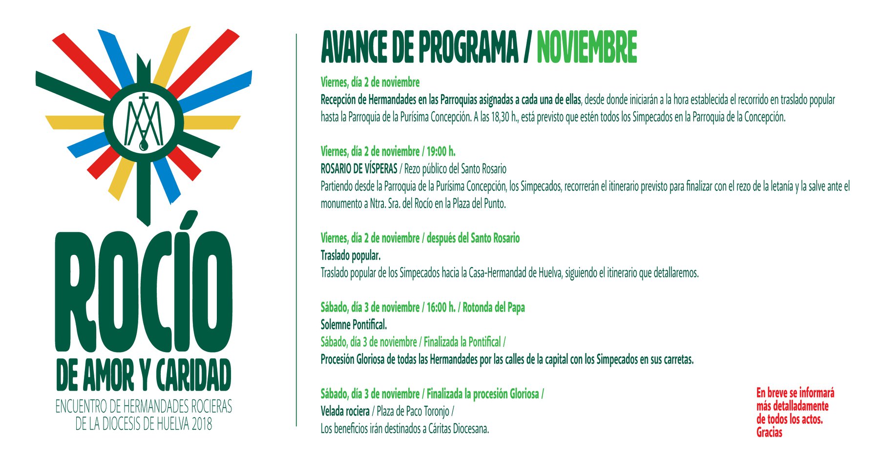 Un total de 29 hermandades filiales del Rocío llegarán a la capital el viernes 2 de noviembre para acudir al encuentro de hermandades rocieras de la Diócesis de Huelva y participar en la magna rociera en su carretas el sábado 3 de noviembre.