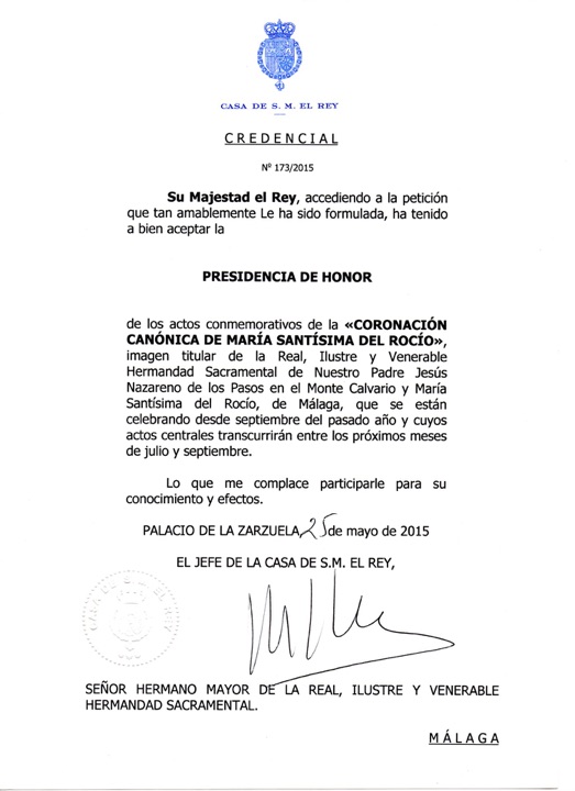 Esta corporación comunica que la Presidencia de Honor de la Coronación Canónica la ostenta Su Majestad el Rey Don Felipe VI desde el pasado 25 de mayo de 2015; así mismo recuerda que desde el 2006 ostenta el cargo de Camarera de Honor Su Majestad la Reina Doña Letizia.