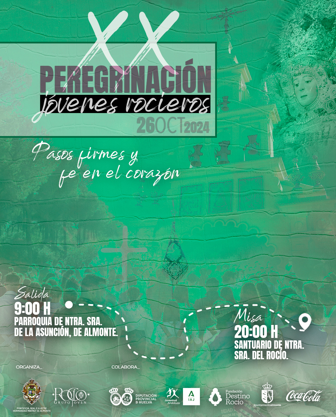 Esta es una peregrinación que requiere de una amplia logística para que todo se desarrolle con normalidad. Esta edición cuenta con el apoyo del Instituto Andaluz de la Juventud, la Fundación Destino Rocío, el Ayuntamiento de Almonte, la Diputación de Huelva y Coca Cola España.