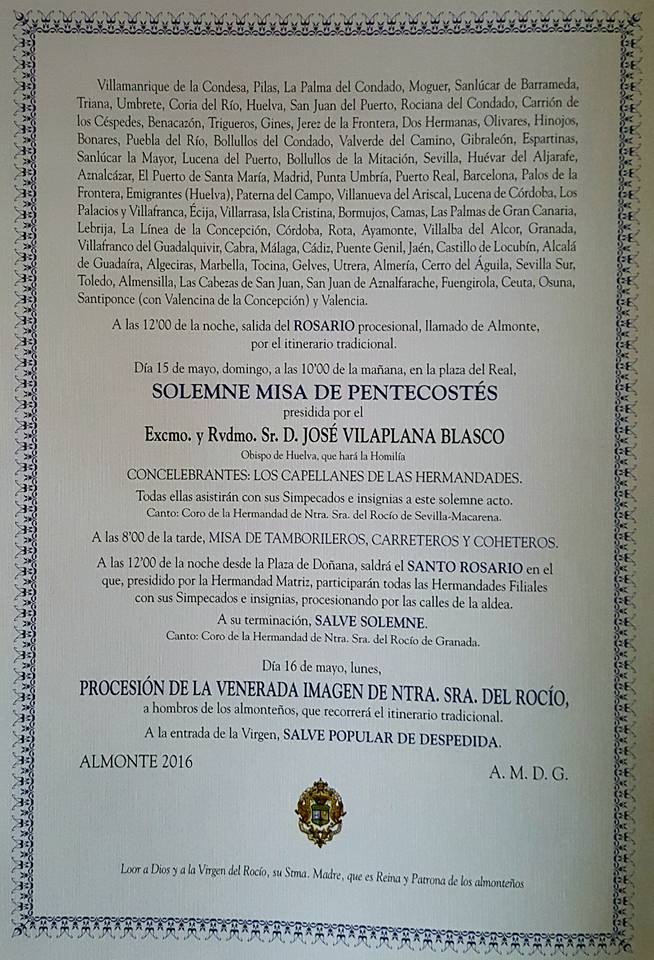 El día 15 de mayo de 2016 a las 10 de la mañana se ha celebrado la Solemne Misa Pontifical Presidida por el Exmo. y Rvdmo. Sr D. José Vilaplana Blasco Obispo de Huelva que hizo la Homilía.