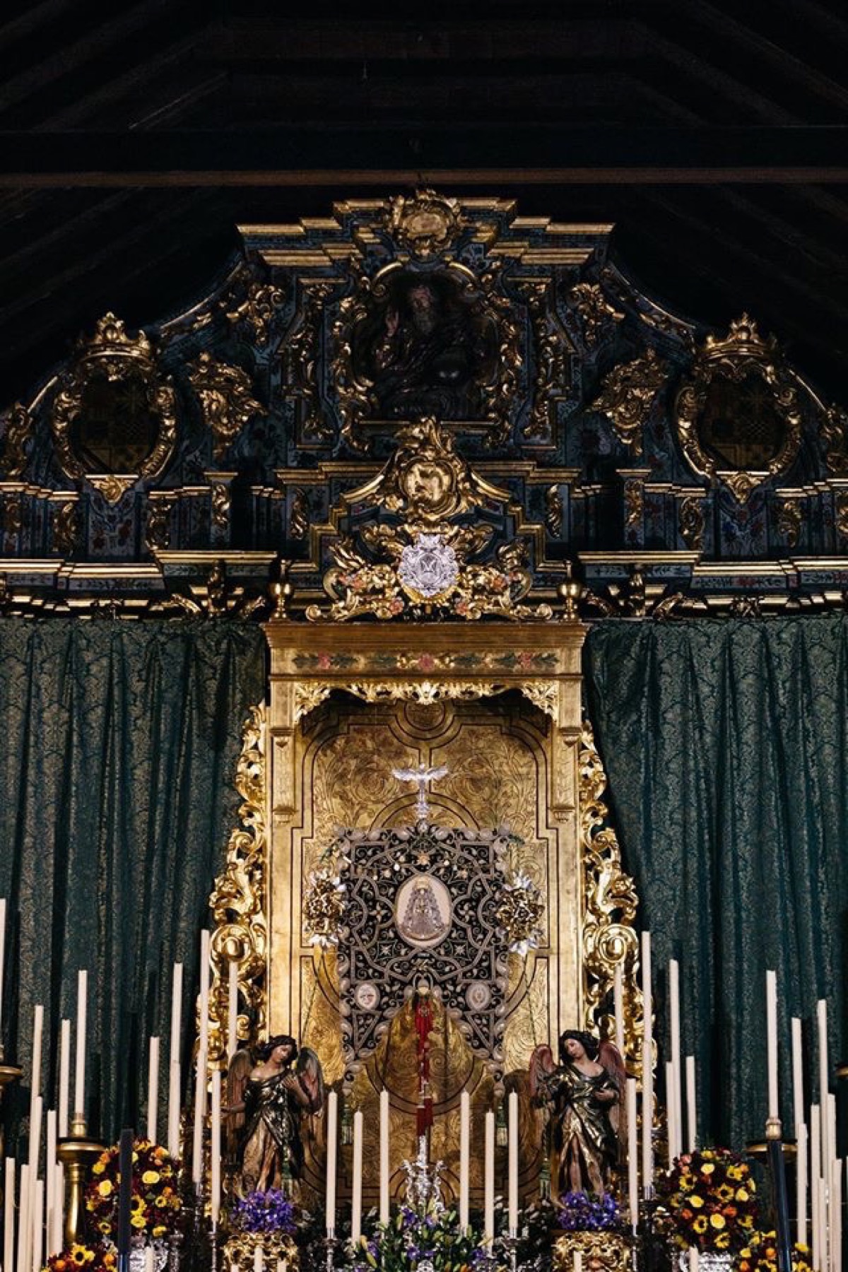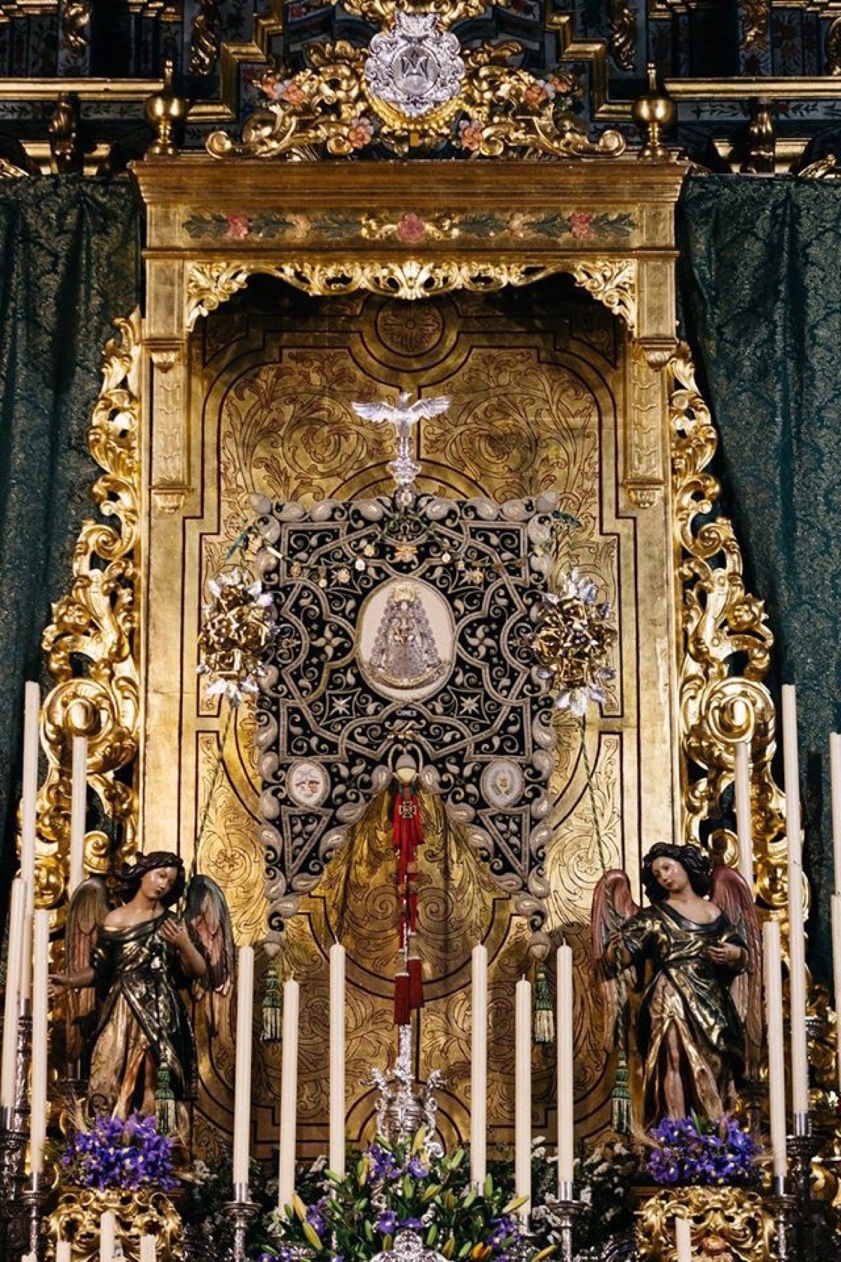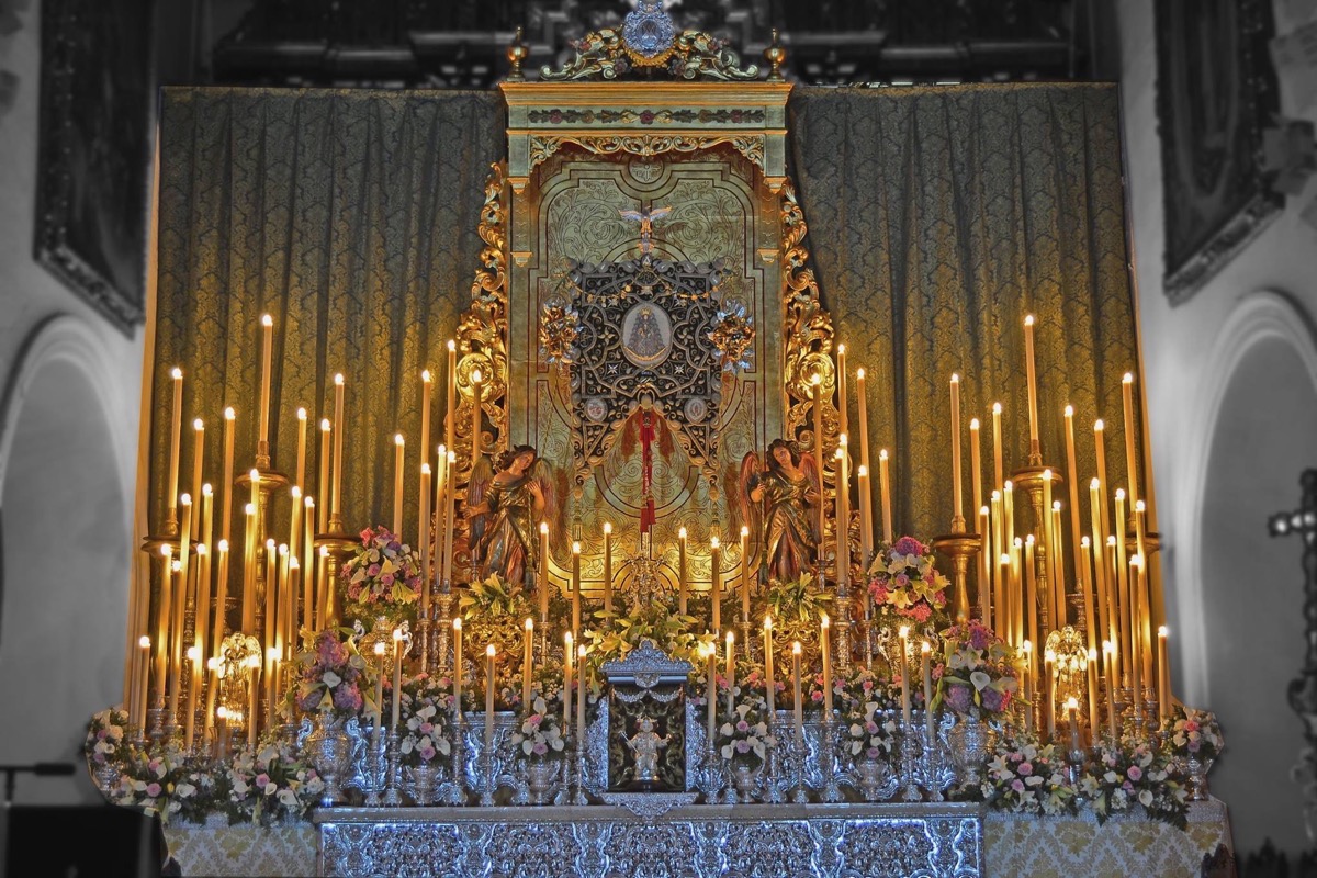 Para la Novena se ha levantado un bello altar compuesto por el dosel de cultos de la Hermandad de Jesús Despojado de Sevilla, custodian al Bendito Simpecado los ángeles de la Virgen del Rosario de la Hermandad de la Macarena, lo completan los respiraderos y la candeleria del paso de palio de Nuestra Señora de los Dolores de la Hermandad Sacramental de Gines, parte de la candelería de la Hermandad Sacramental de Espartinas, que gentilmente nos ha cedido también una peana para la manifestación del Santísimo Sacramento. Flanquean el dosel los blandones de la parroquia. El Divino Pastorcito se encuentra cobijado bajo un dosel compuesto por una antiguo banderín de la hermandad bordado y varias piezas de orfebrería de nuestra carreta. Se ha estrenado la restauración de las cuatro jarras de la carreta. En el altar también figuran nuestros dos ángeles custodios de plata. A lo largo de esta novena se han encendido más de 90 candeleros, y se han efectuado dos cambios del exorno floral. La primera puesta compuesta por flores de Alcatraz, hortensias, azucenas, estatices, rosas y clavellinas, en tonos blancos y rosas. La segunda puesta está compuesta por rosas, claveles, alstroemerias, anthirinum, liliums, hypericum y clavellinas, en tonos granas, amarillos y naranjas, salpicado por iris morado. Las columnas de la parroquia se han engalanado con guirnaldas. Nuestro Bendito Simpecado luce por primera vez unos bellos ramilletes de flores de talco, compuestos por rosas y azucenas, diseñados y realizados por el bordador José Ramón Paleteiro Bellerín.