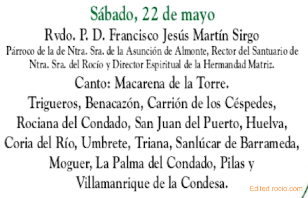 Trigueros, Benacazón, Carrión de los Céspedes, Rociana del Condado, San Juan del Puerto, Huelva, Coria del Rio, Umbrete, Triana, Sanlúcar de Barrameda, Moguer, La Palma del Condado, Pilas, Villamanrique de la Condesa.