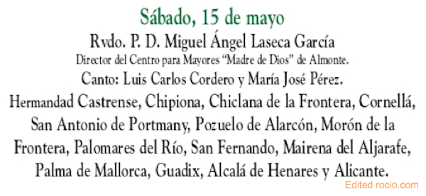 Hermandades participantes: Castrense, Chipiona, Chiclana de la Frontera, Cornellá, San Antonio de Portmany, Pozuelo de Alarcón, Morón de la Frontera, Palomares del Río, San Fernando, Mairena del Aljarafe, Palma de Mallorca, Guadix, Alcalá de Henares y Alicante.