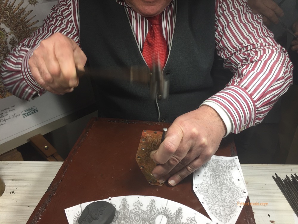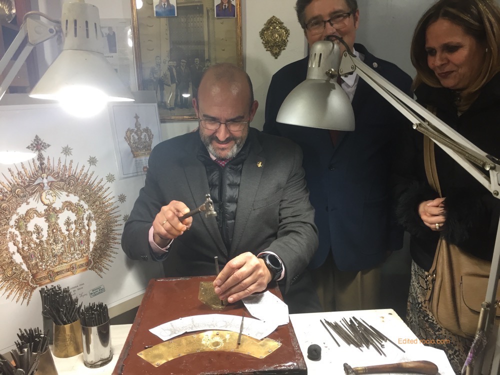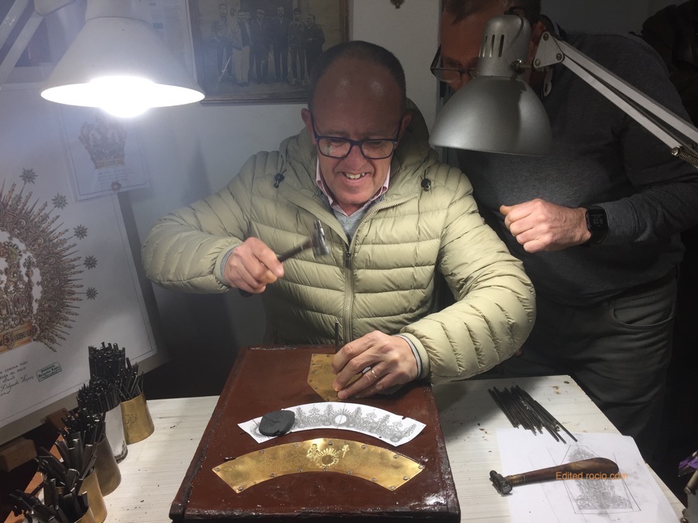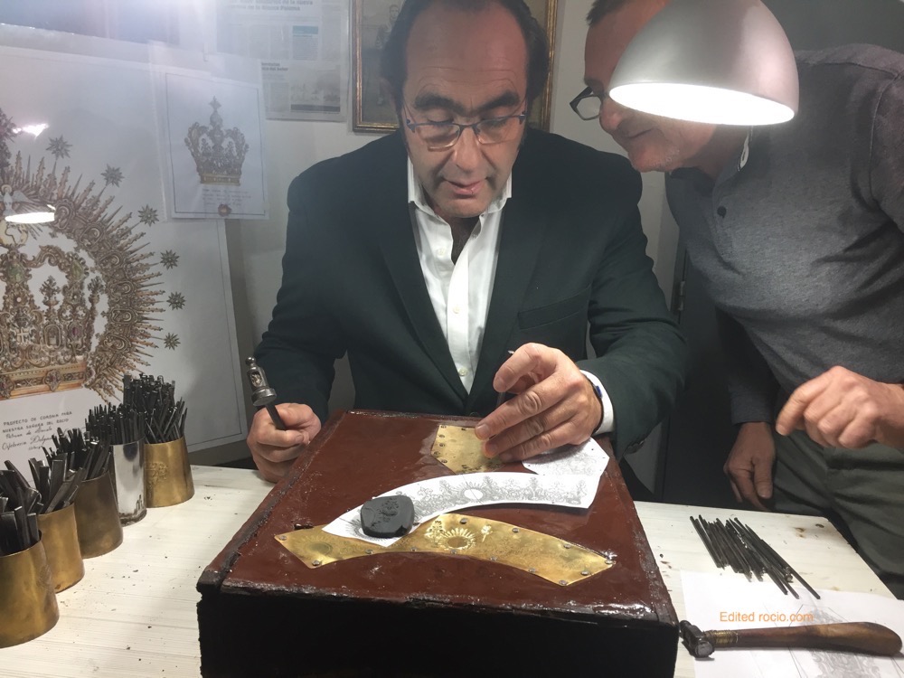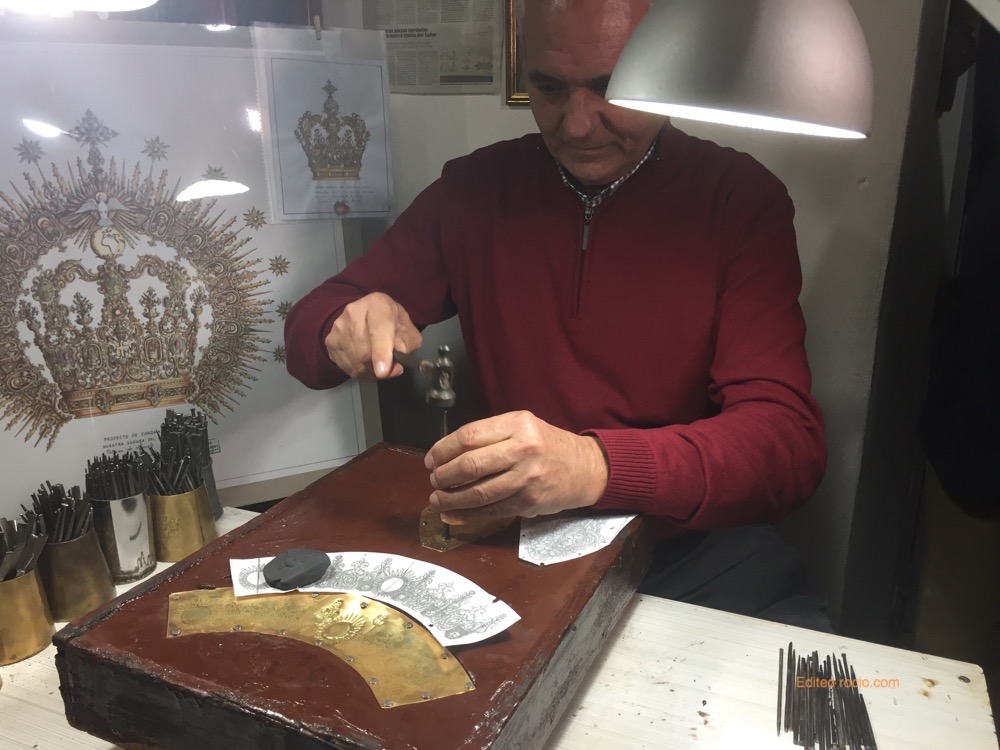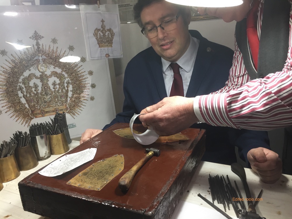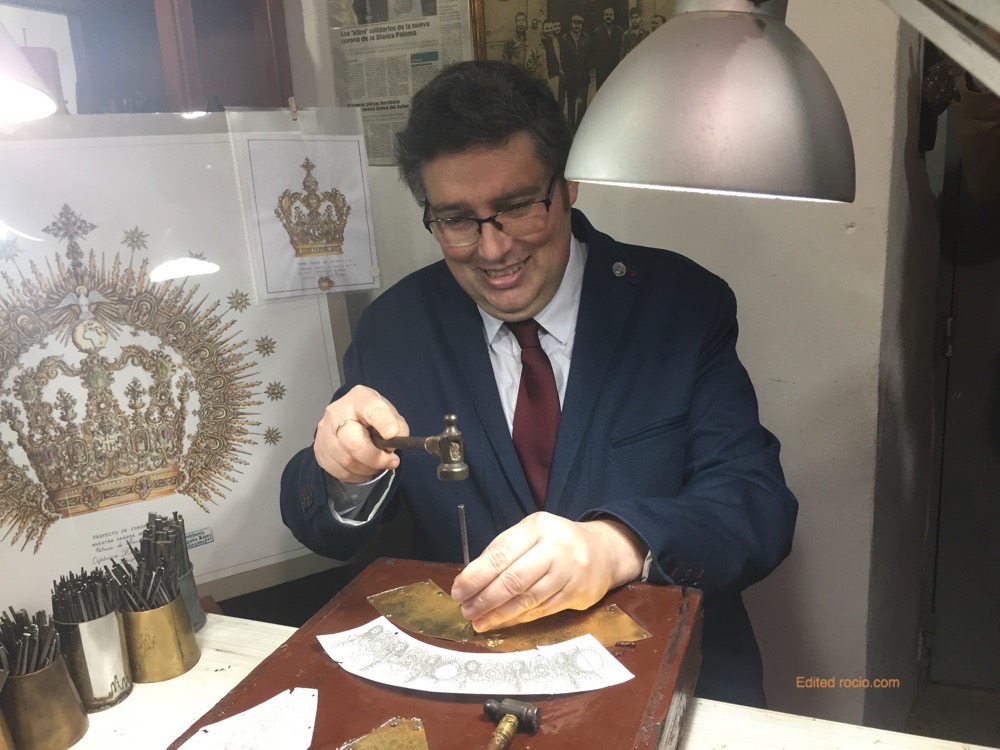 D. Luis Fernando Morian Prado, presidente de la Comisión de las Hermandades y Asociaciones del Rocío cincelando la Corona del Pastorcito